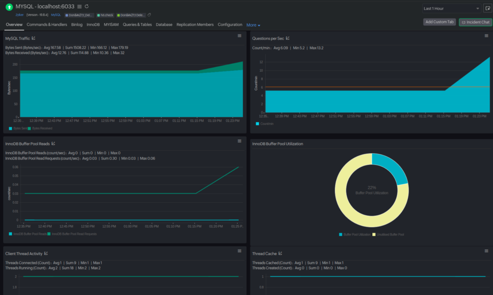 Scenario : On the MySQL dashboard, a sustained buffer pool utilization (below 95%) alongside high InnoDB Data Reads indicates the database is frequently reading from disk. Site24x7 allows you to drill down to identify the specific queries causing the most disk I/O, providing you with the insights needed to optimize or rewrite those queries.