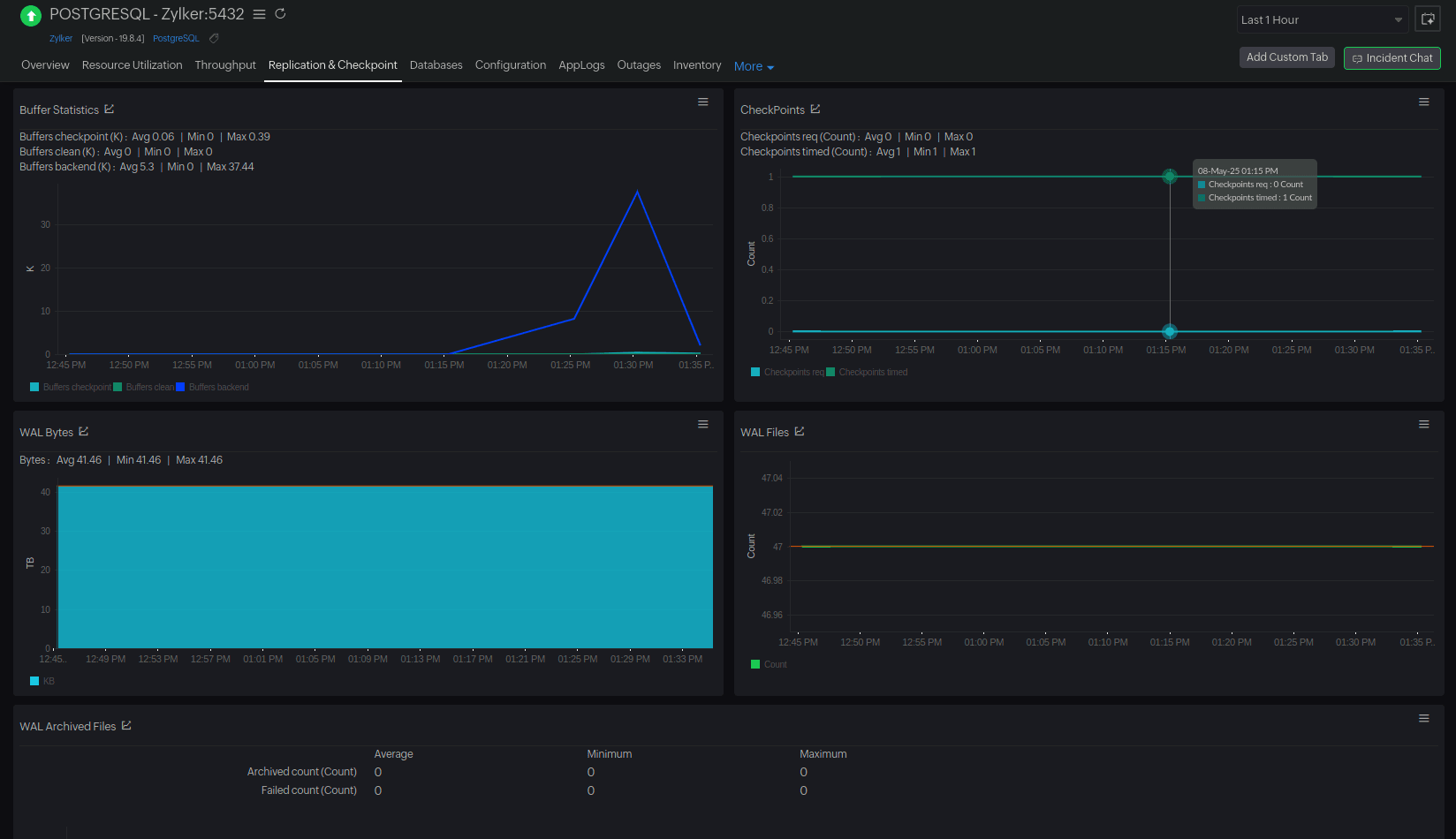 Scenario : The PostgreSQL dashboard displays a sudden spike in WAL Bytes, especially when paired with a sharp rise in Updated Rows. This likely indicates that there are write-heavy workloads—such as bulk updates, batch processing, or unoptimized update operations. Site24x7 allows you to spot the spike and alerts you before a potential crash or bottleneck.