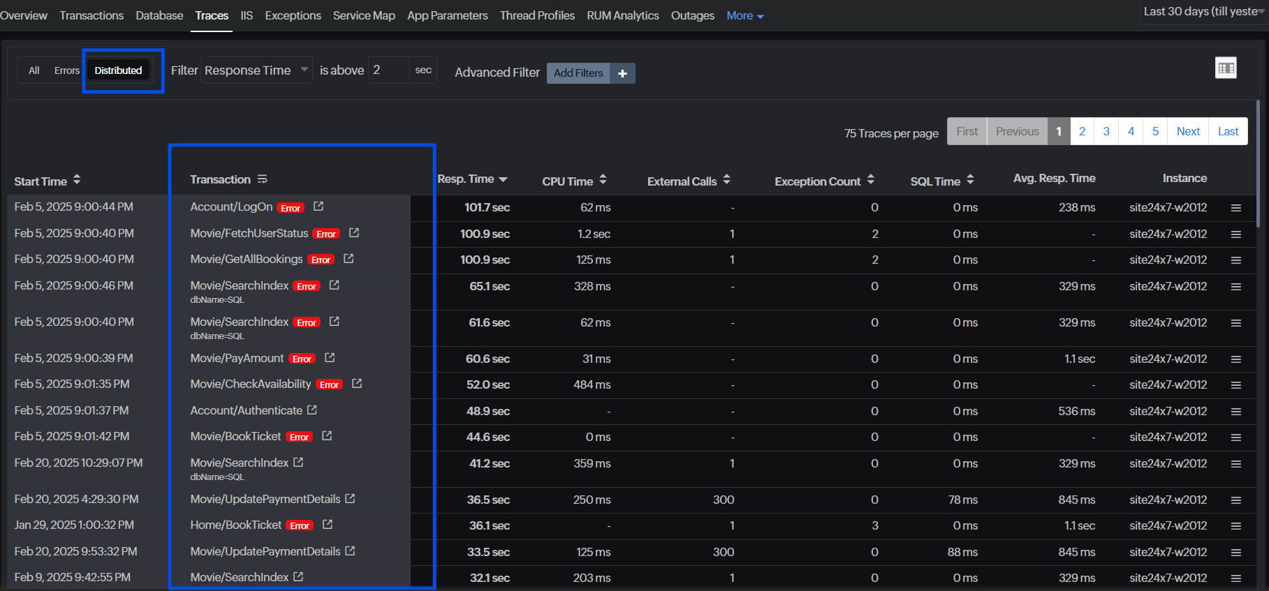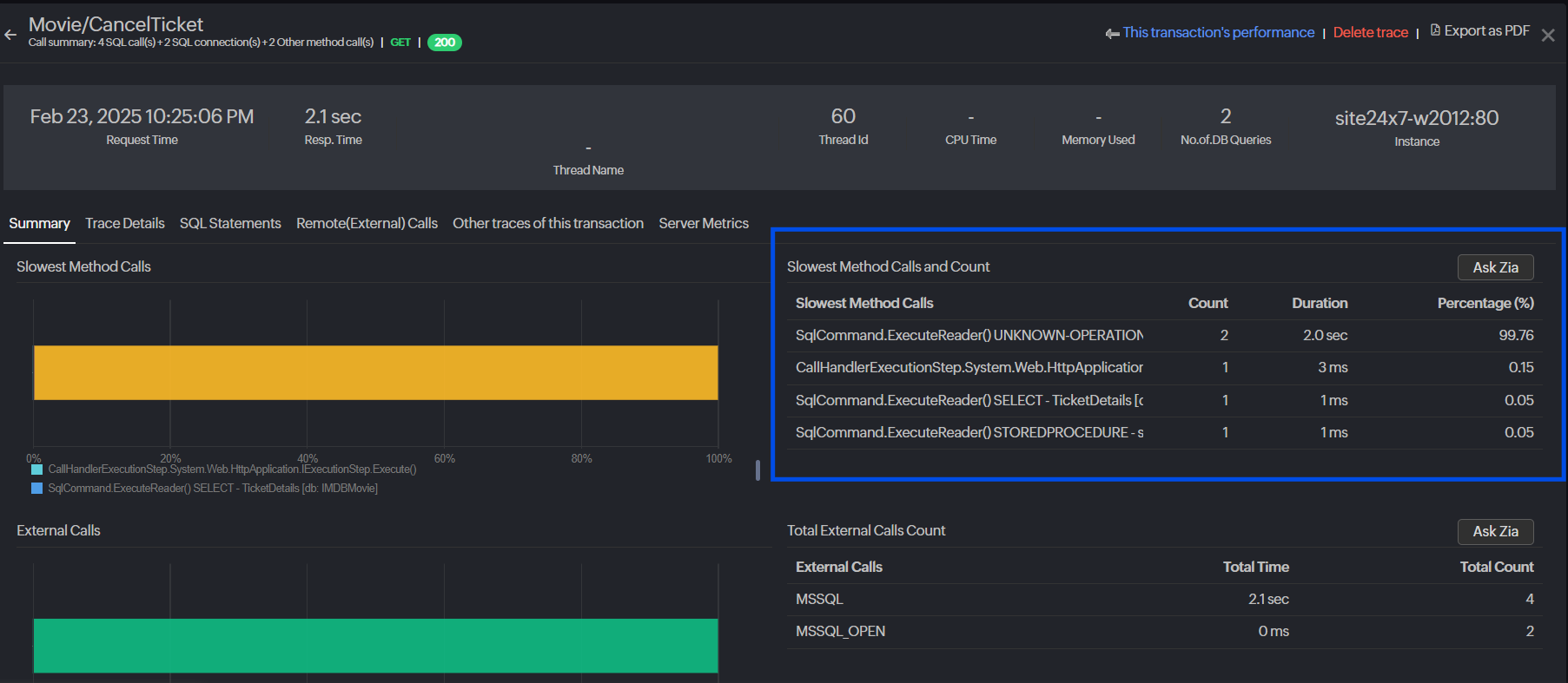 Site24x7’s APM enables code-level transaction monitoring, allowing teams to track execution times, error rates, and dependencies for each invocation. Custom instrumentation helps teams monitor specific functions in their code, while tracing tools pinpoint slow database queries, cold starts, and API latency issues.