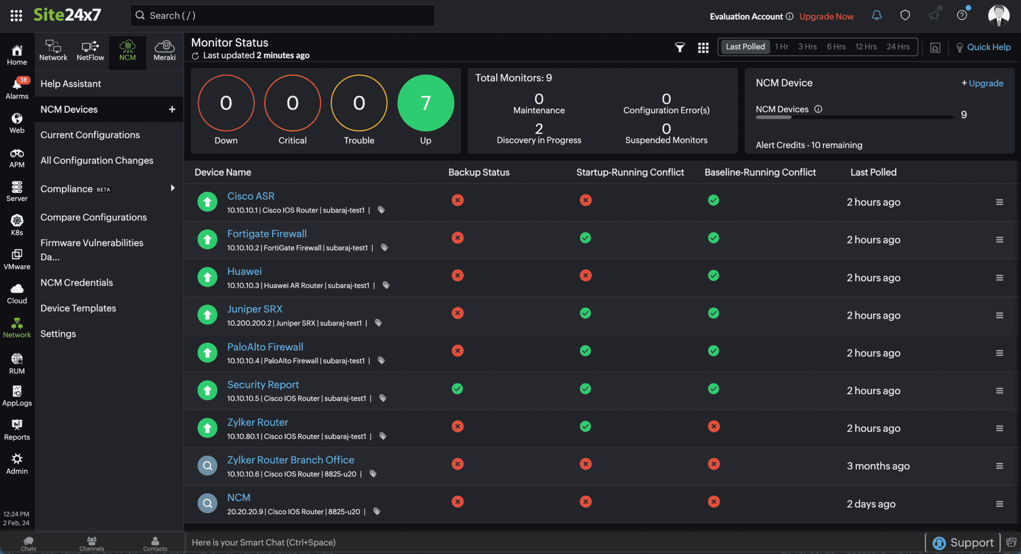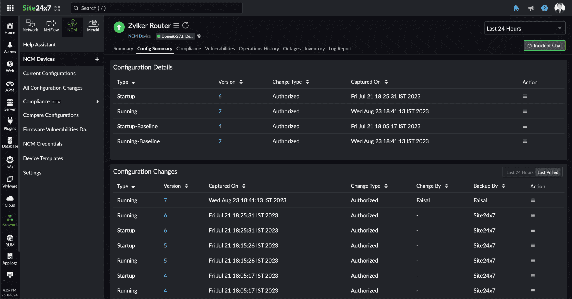 If you are among the many who are tired of getting lost in the labyrinth of network intricacies or are frustrated with frequent network outages, Site24x7's automated network configuration management solution is just for you. With Site24x7, you can finally say goodbye to the tangles of network management and hello to the convenience of user-friendly dashboards that provide you with real-time updates on your network's status.
