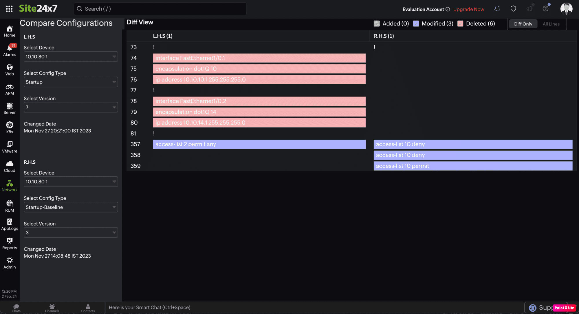 With Site24x7, rolling back a configuration to its original or desired version can be done quickly and easily. If there is a network outage, you can choose the upload option to restore the last working configuration version. This process ensures that the device will be operational again, eliminating any downtime in network devices. By restoring the configuration, network administrators have sufficient time to investigate the cause of the network outage and can implement the necessary corrective measures without impacting business continuity.