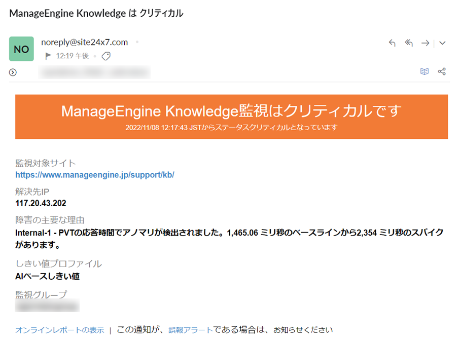 AIベースしきい値を設定している監視でアラートが発生すると、次のアラートメールが通知されます。