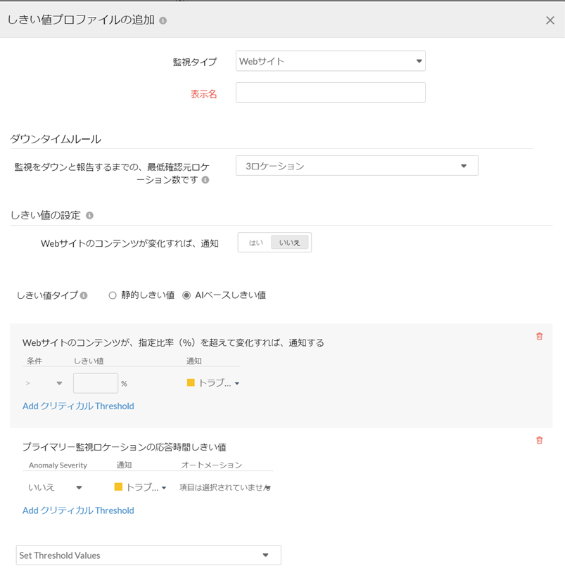 すべての監視とパフォーマンスデータに対して、AIベースしきい値のプロファイルは設定できません。
