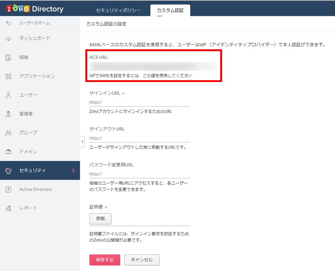 サインインURL:上記Azure手順8の画面で、Zoho Directoryの設定欄にあるログイン URL