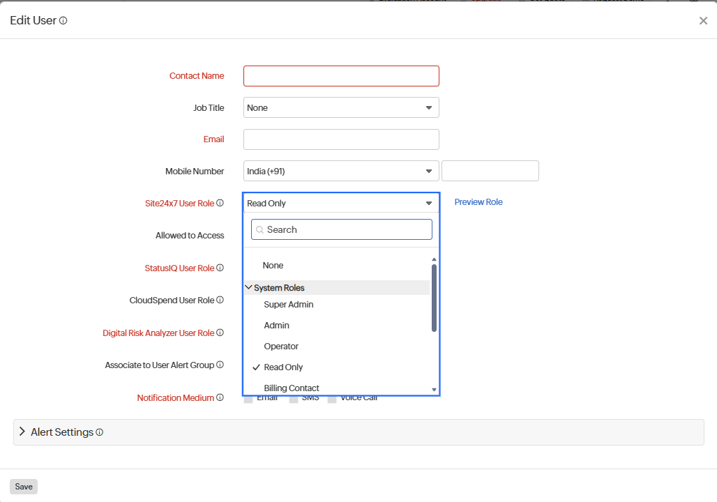 Site24x7 lets you have a control over the access level of the users and the administrator of an account can add multiple users by providing them with various access permissions. Following are the user roles in Site24x7, which can be entailed to a ...