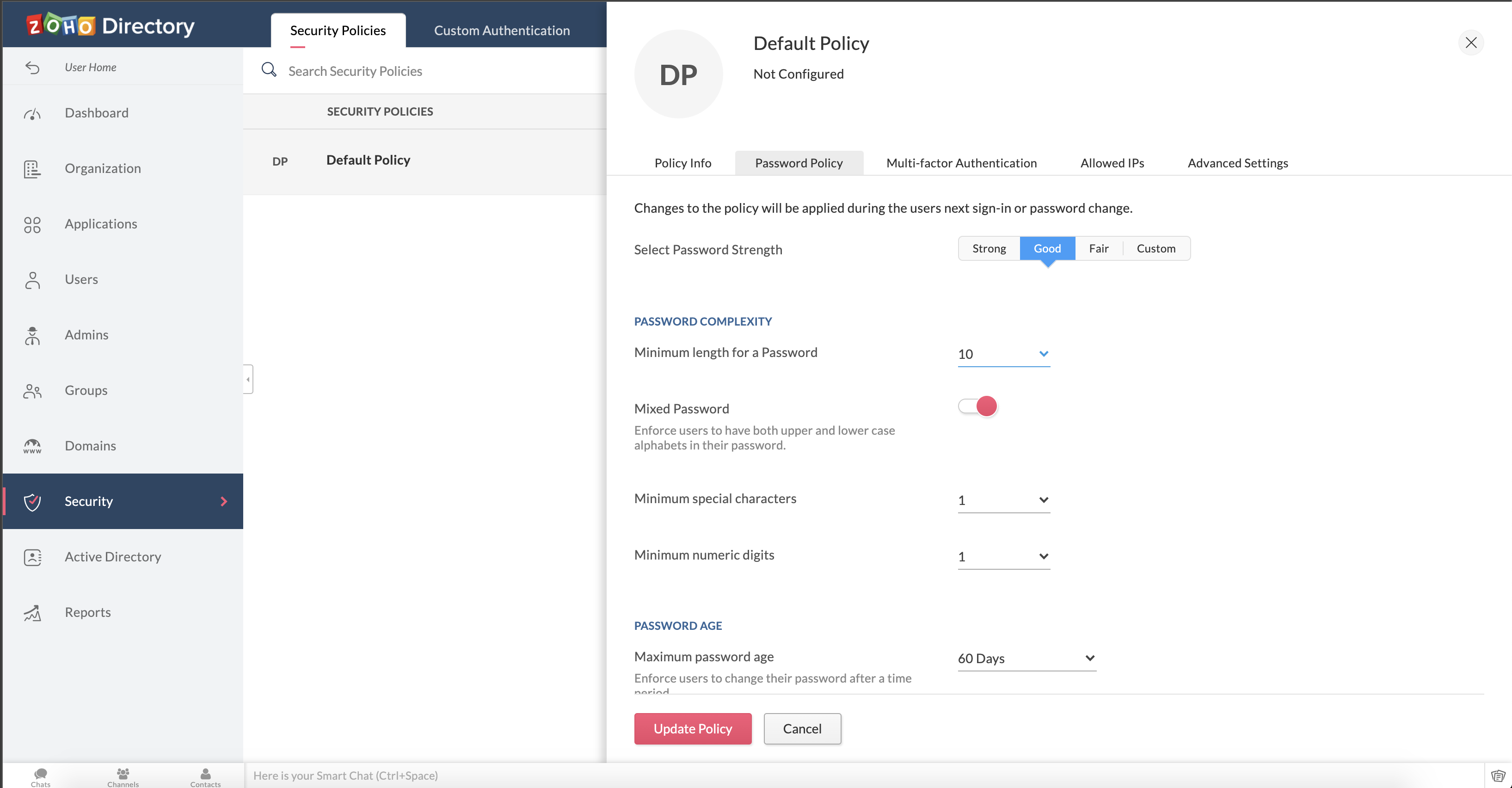 パスワードポリシーの設定にはZoho Directoryアカウントの管理者権限が必要です。