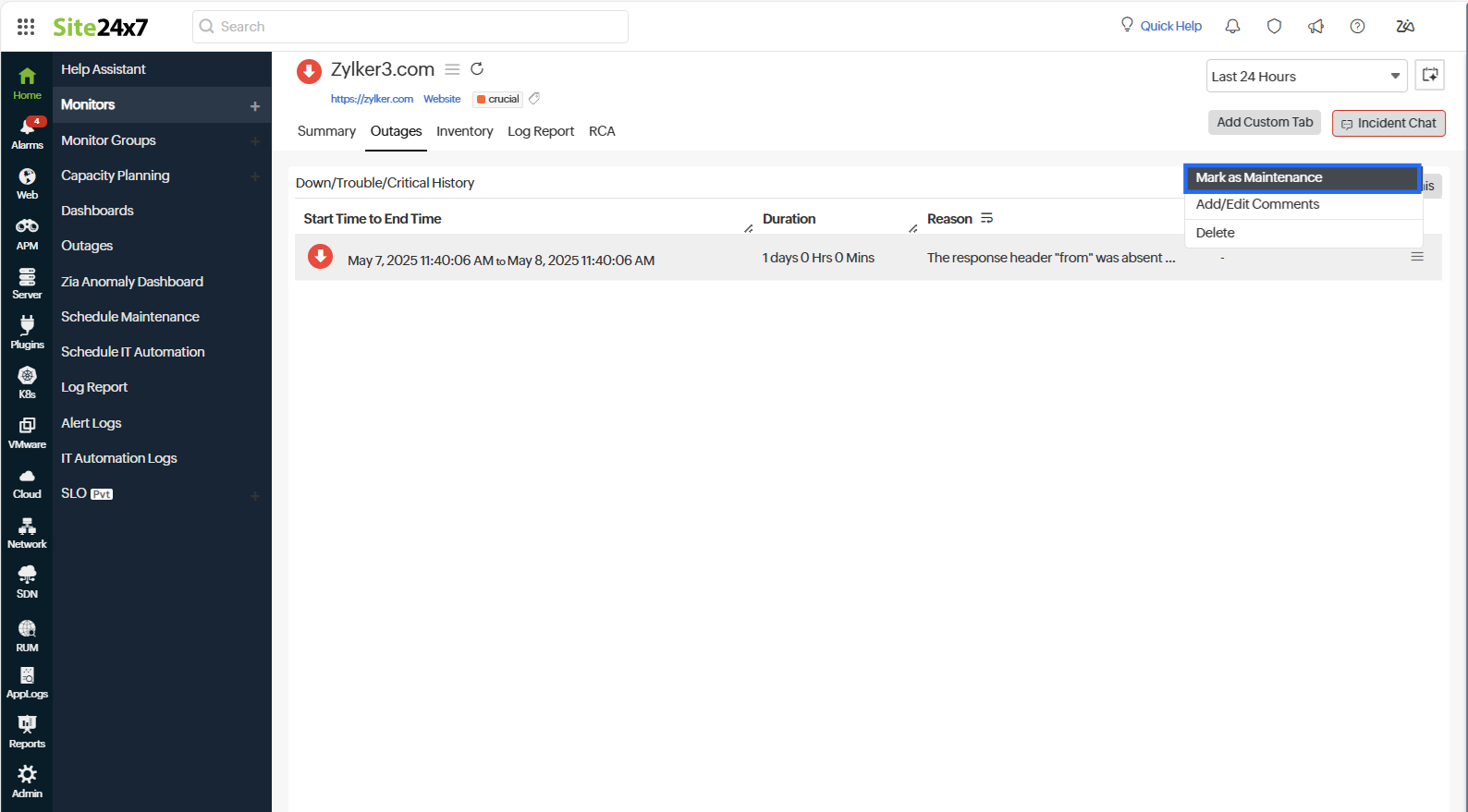down status during this window. The maintenance period affects the overall availability, which is then reflected in the availability report. To avoid this scenario, you can customize your availability reports to treat monitors as "