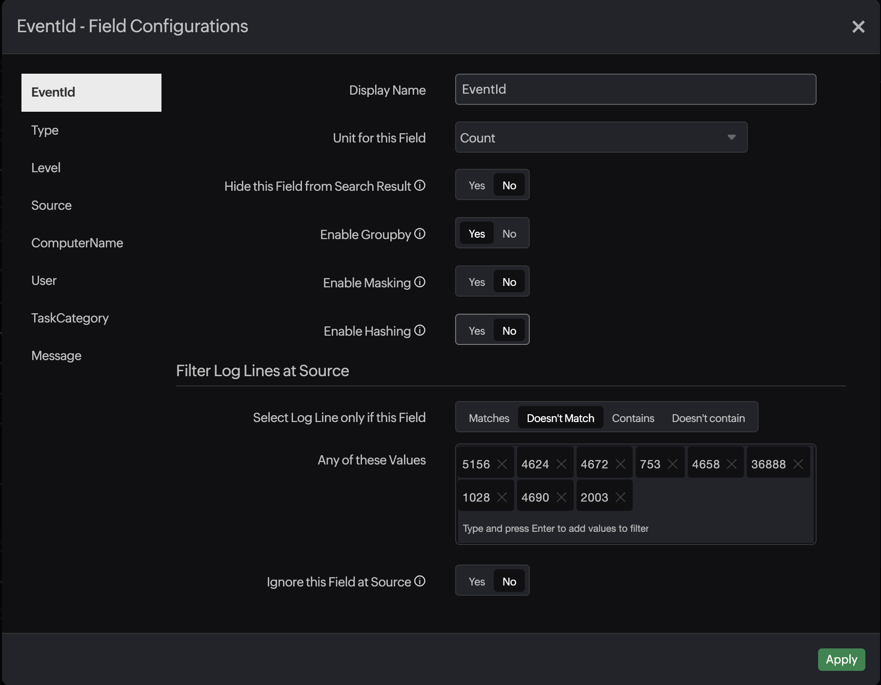 3. Define the unwanted event IDs under the Filter Log Lines at Source section. To accomplish this, complete both of the actions below: 4. Click Apply.