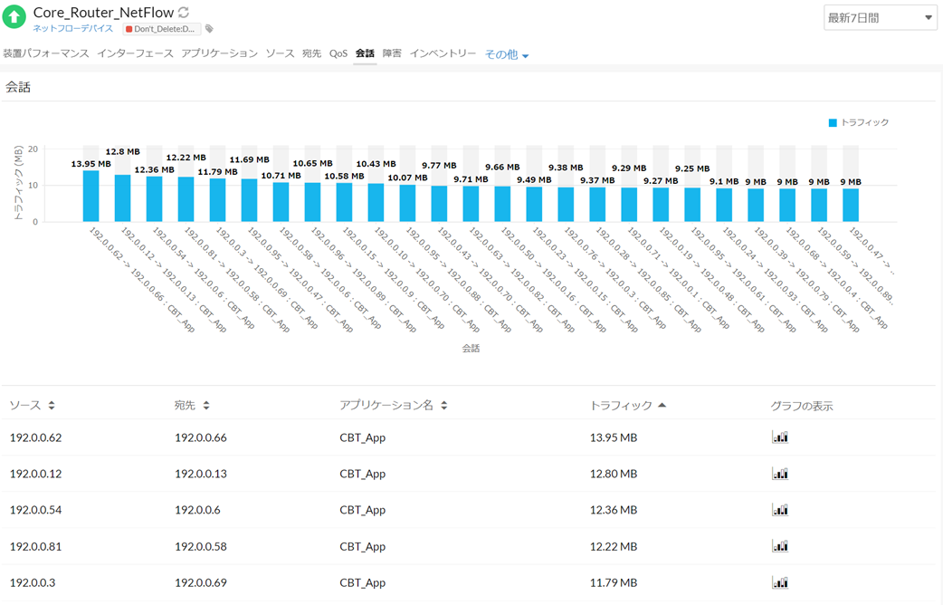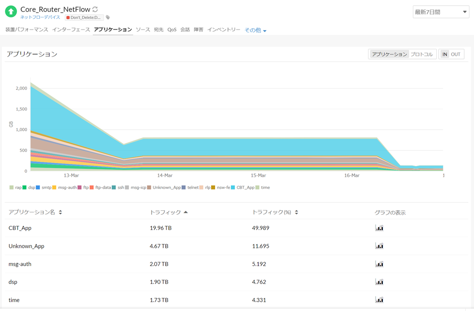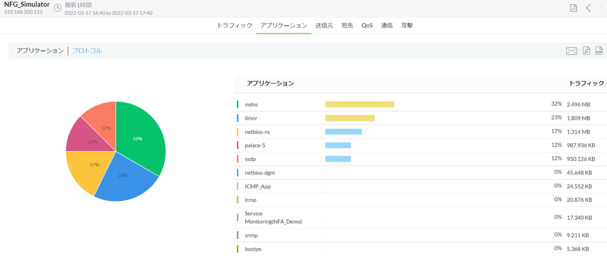 取得フローをアプリケーションやプロトコル単位で分類し、ネットワーク負荷の分析と原因特定を行えます。