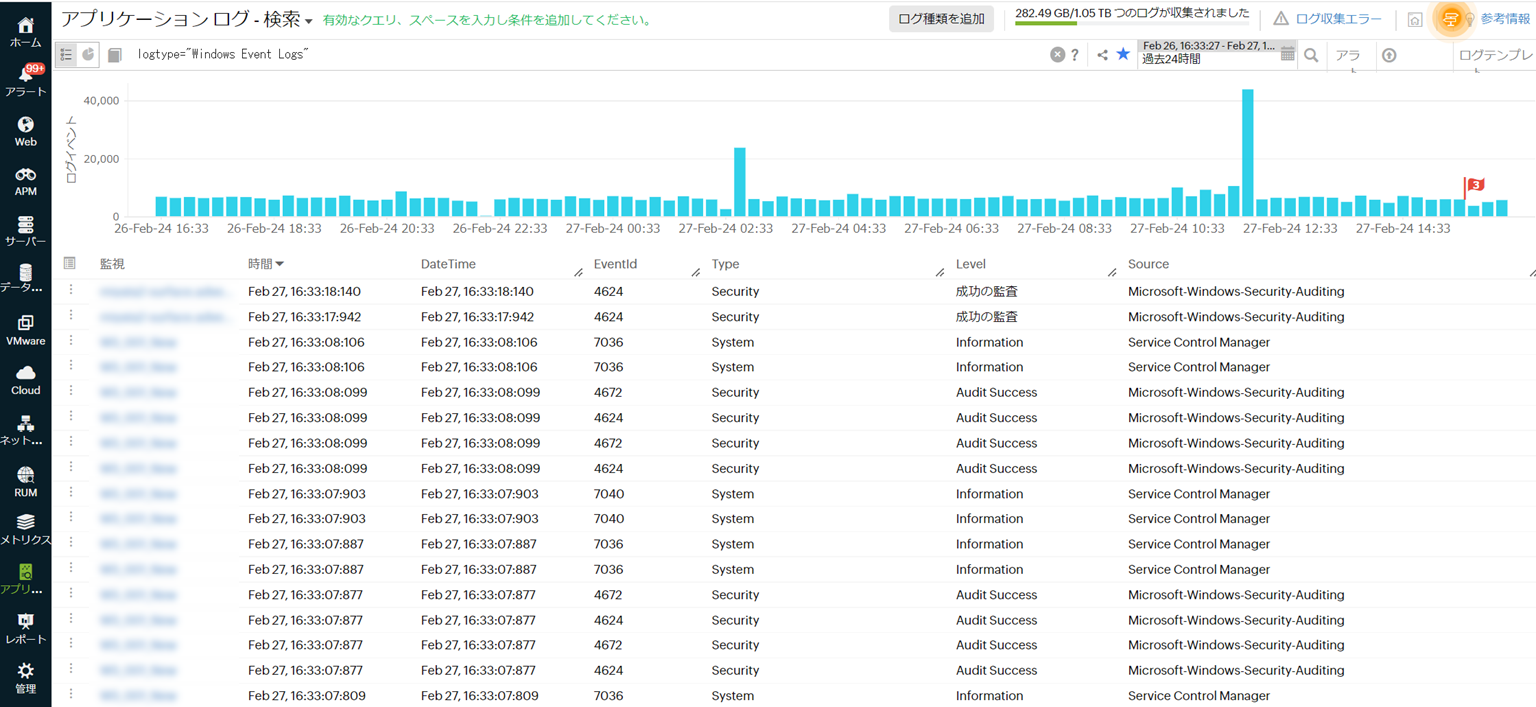 例として、Windowsイベントログのエラーログを検索したい場合は、次のクエリを入力します。