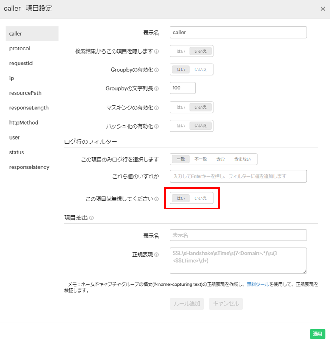 ログパターン:指定したサンプルログに基づいて、収集するログの形式が自動で入力されます。同画面の[項目設定の編集]から必要のない項目を除外できます。
