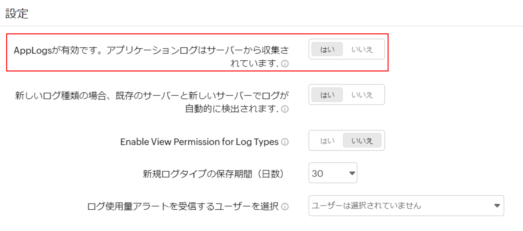 - [管理]→[アプリケーションログ]→[設定]に移動します。