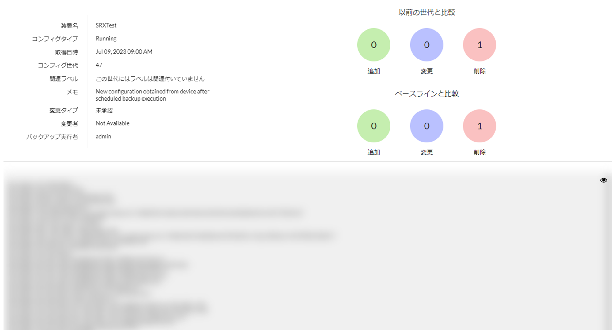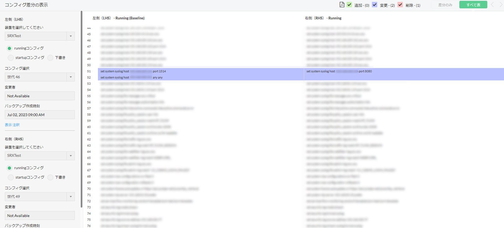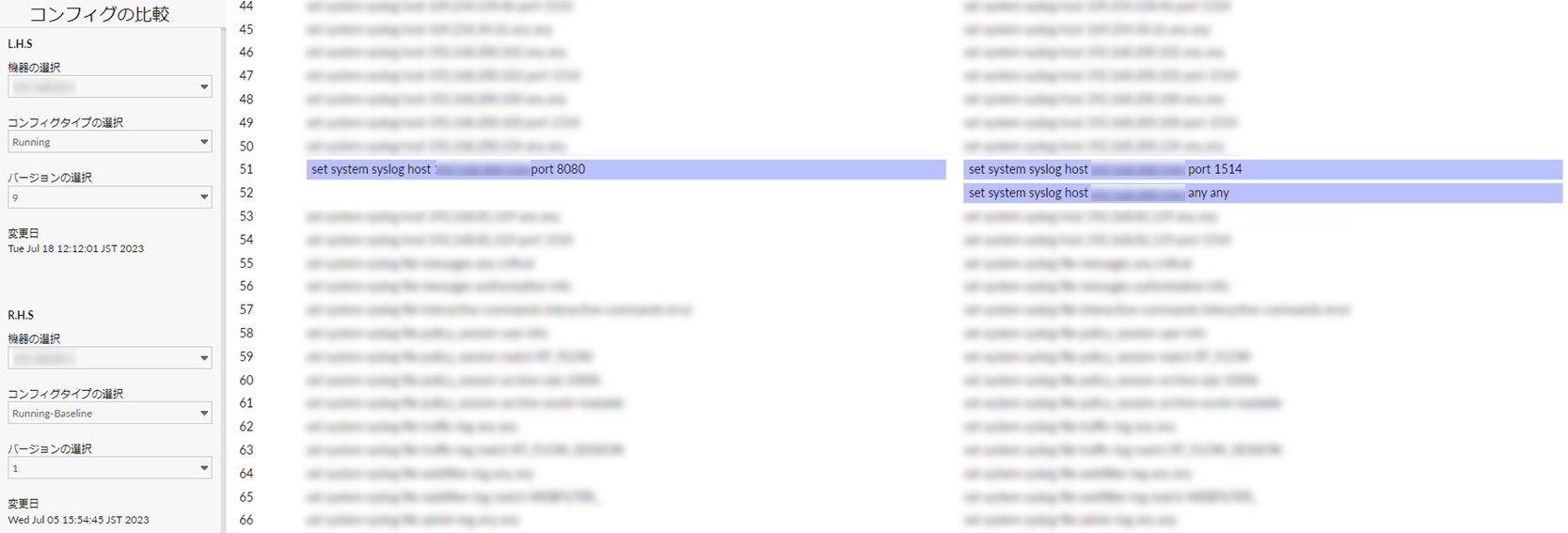 取得したコンフィグをベースラインや特定のコンフィグ世代と比較し、差分を表示します。