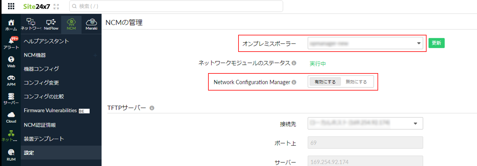 (監視対象装置と同一ネットワーク内に存在しており、疎通が取れるサーバーにインストールしてください) - [ネットワーク]→[NCM]→[設定]に移動します。