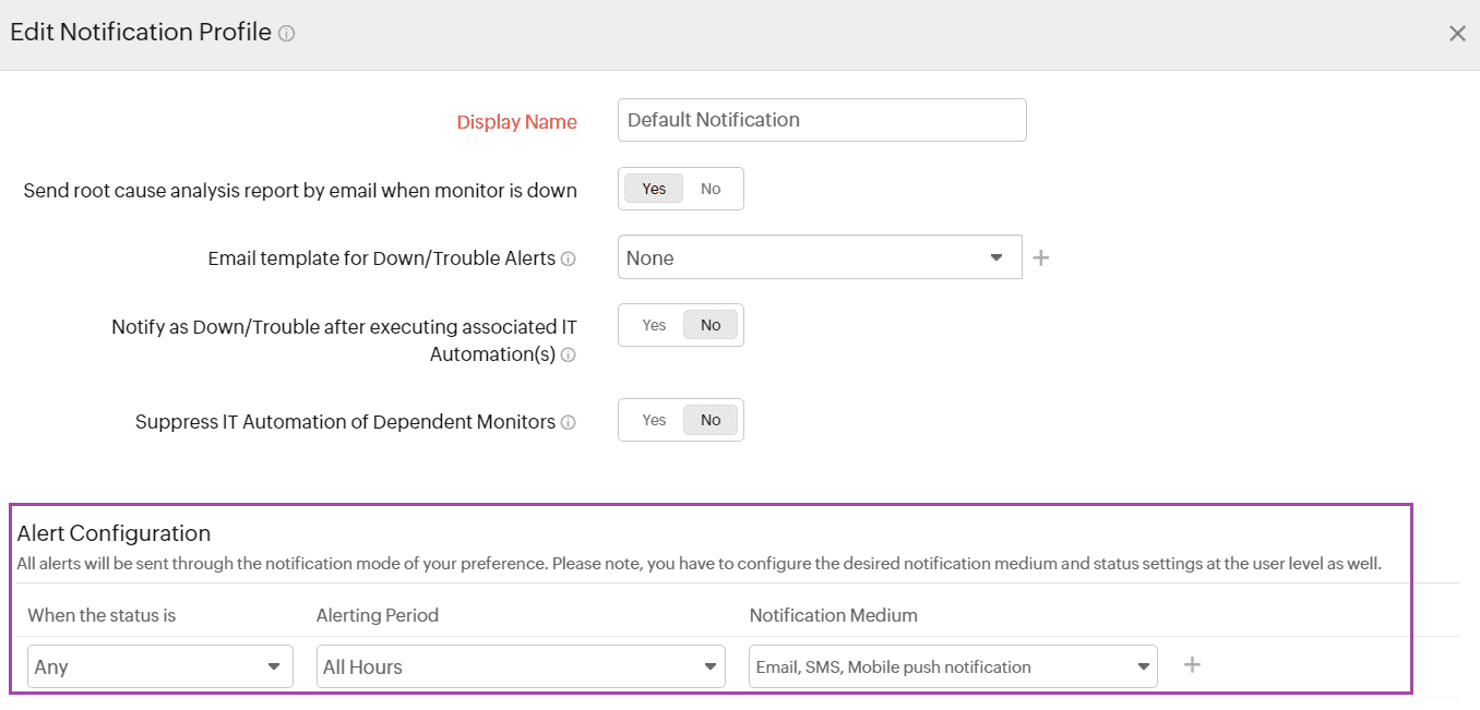 - In the Edit Notification Profile screen, choose your preferred modes of alert listed under the Alerts Configuration section.