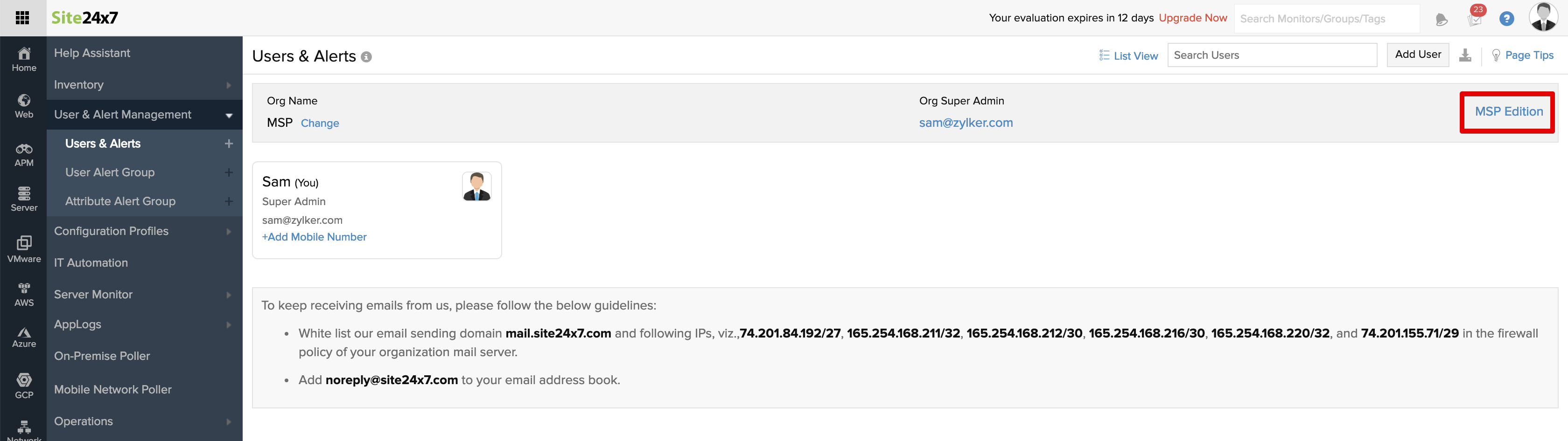 Navigate to Admin > User & Alert Management > Users & Alerts . Click the MSP Edition link on the top right of the dashboard.