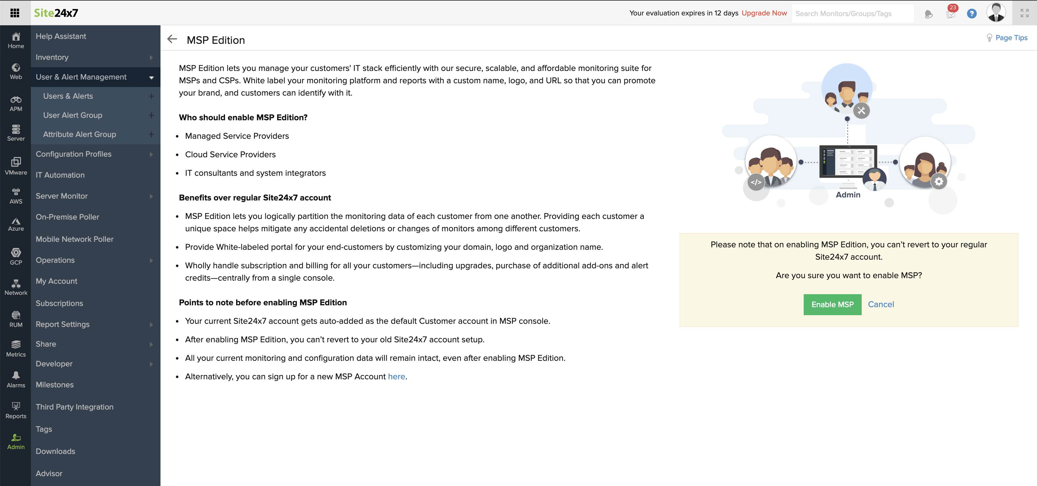 4. [Enable MSP] ボタンをクリックし、Site24x7アカウントをMSP Editionに移行します。