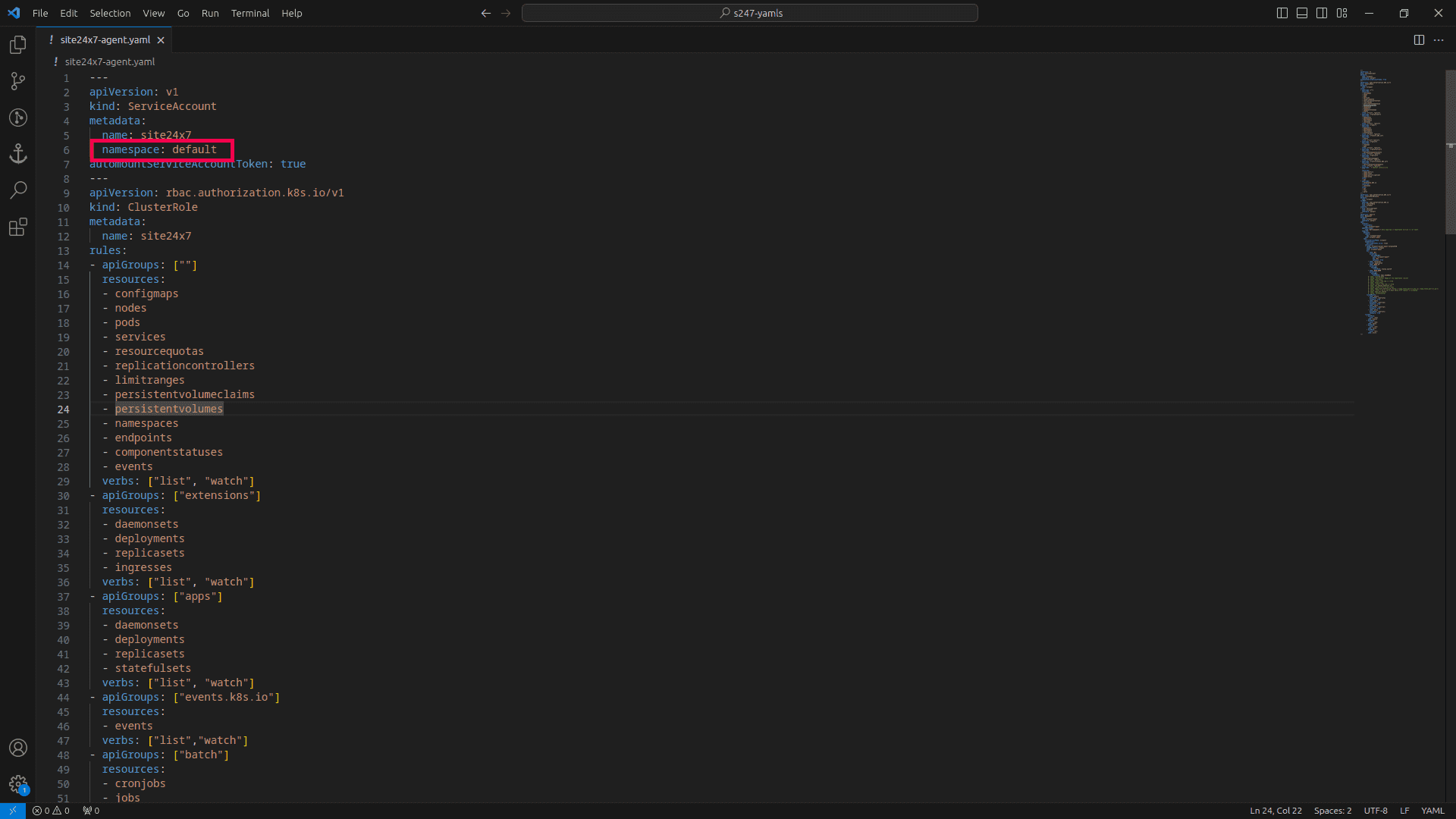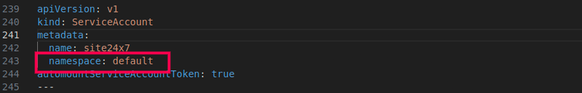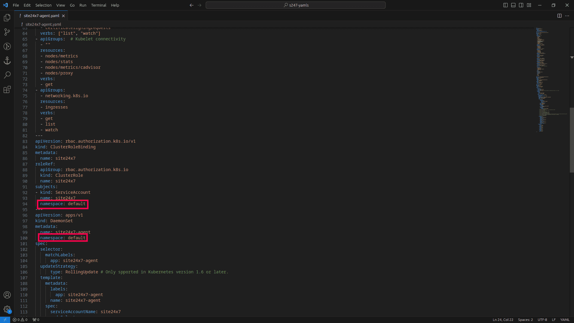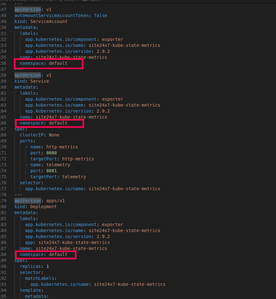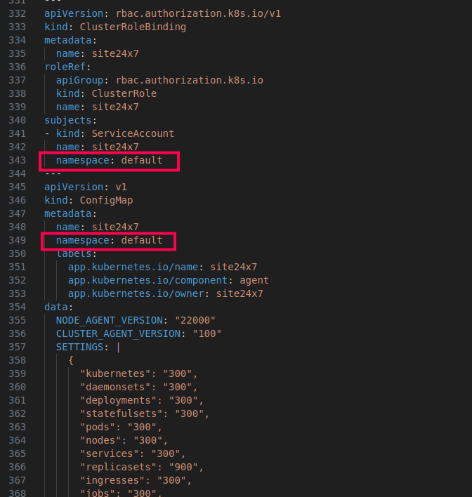 In the Site24x7 agent YAML file, replace the namespace in the highlighted fields: