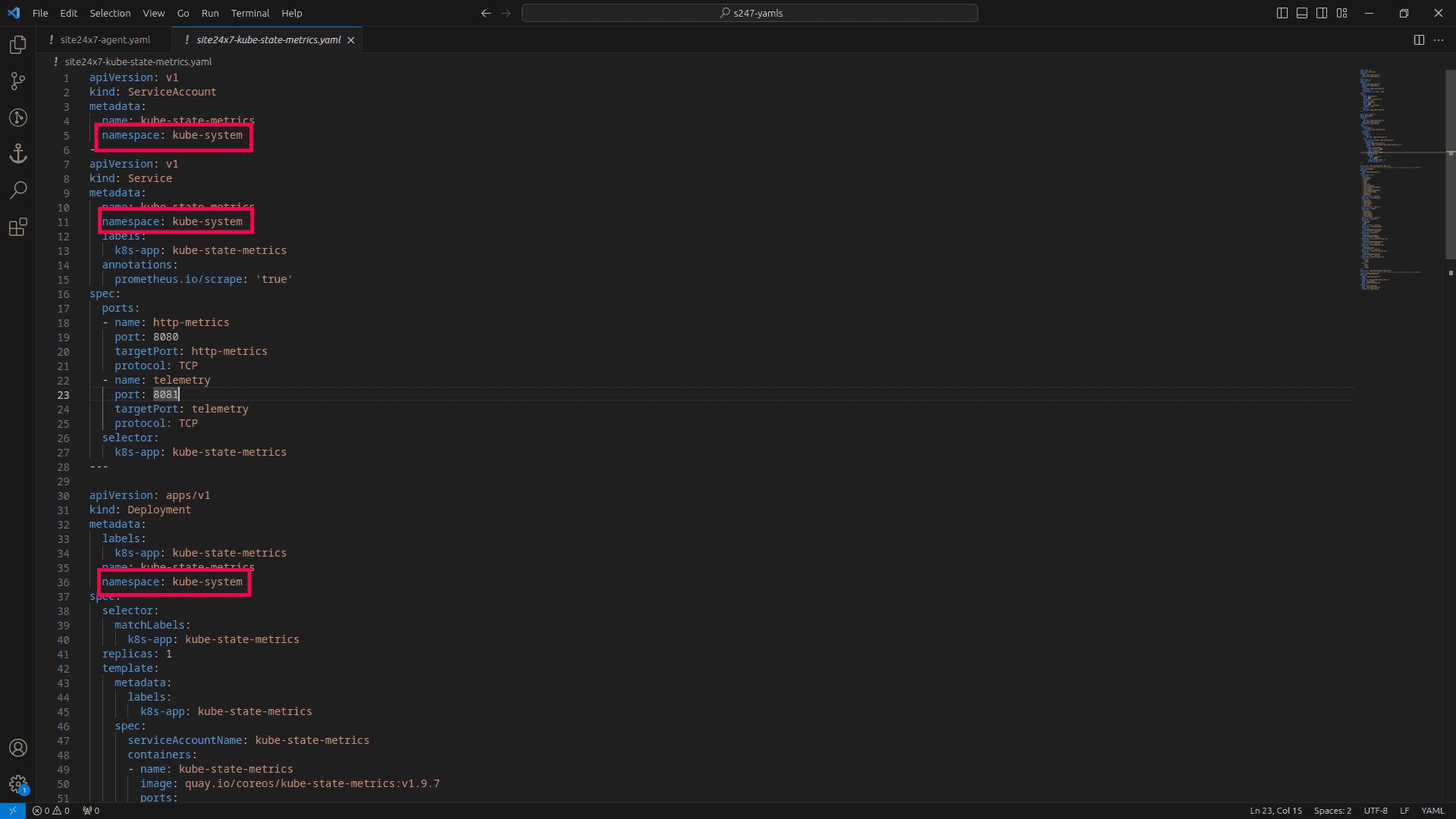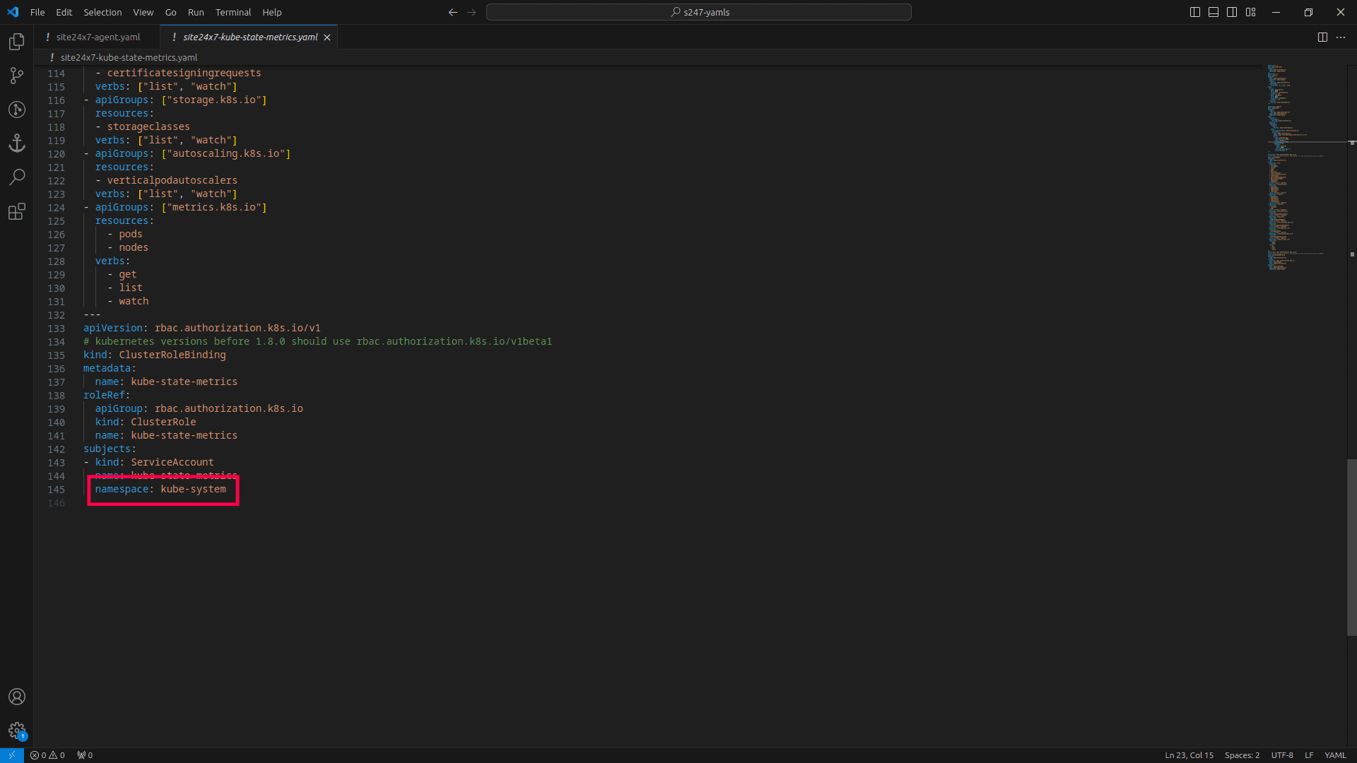 By default, kube-state-metrics will be deployed in the kube-system namespace. If necessary, replace the namespace in the highlighted fields in the kube-state-metrics YAML file: