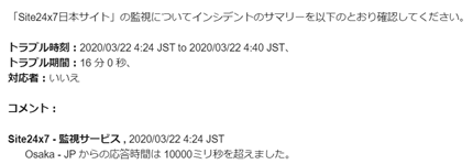 次のような本文のインシデントの概要メールが、デフォルトで受信できるようにSite24x7では設定されています。
