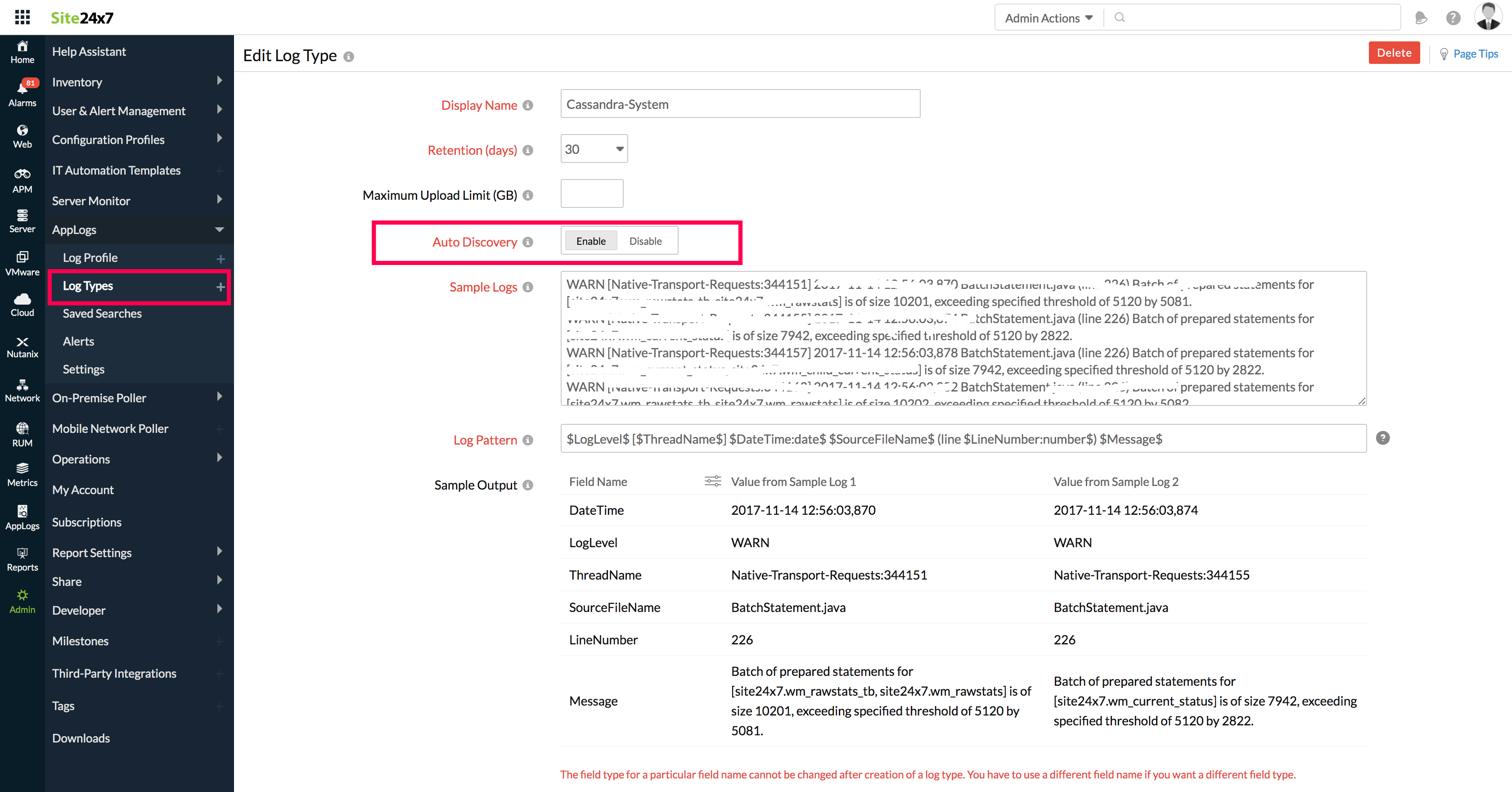 To do this, navigate to Admin > AppLogs > Log Types > Cassandra Logs (or any log type for which you want to disable collection) > Disable auto discovery.