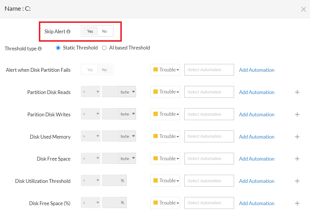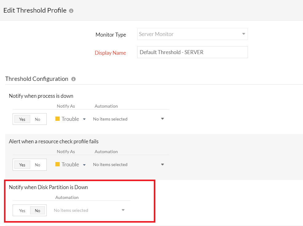 Disable/remove threshold configuration for disk partitions globally in server threshold profile: Go to the respective server monitor's threshold profile (Server > Server Monitor > Servers > click on the server monitor > hover on the hamburger icon beside the display name > Edit) and ensure the option Notify when Disk Partition is Down is set to No.