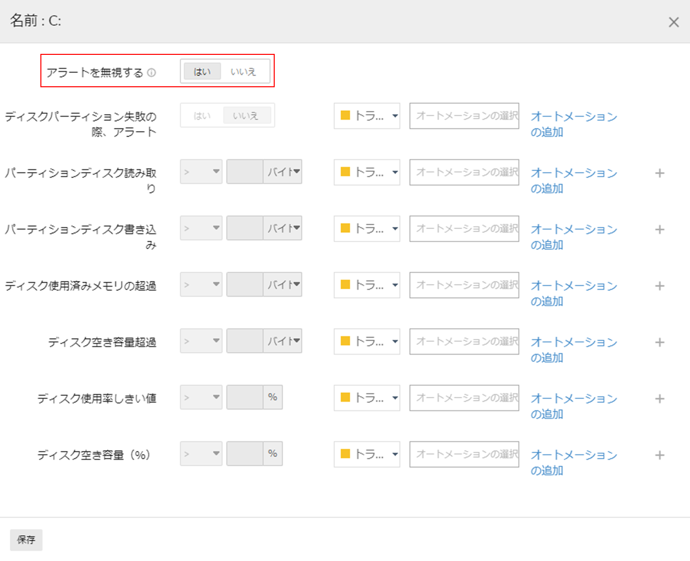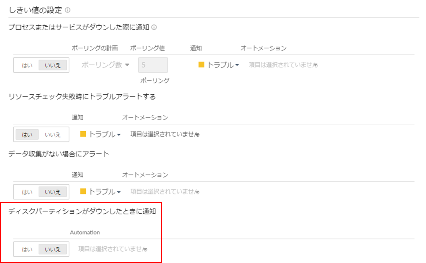 - しきい値と可用性横の鉛筆(編集)アイコンから「ディスクパーティションがダウンしたときに通知」を[いいえ]に指定