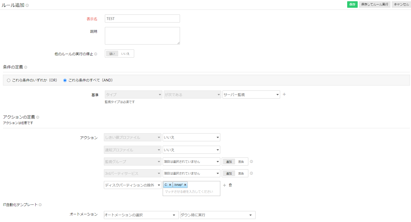ルールを用いて監視からディスクパーティションを除外します。「C:」のようにディスクパーティション名の入力や、「/snap.*」のように正規表現を用いて/snapの全てのディスクパーティションを除外することができます