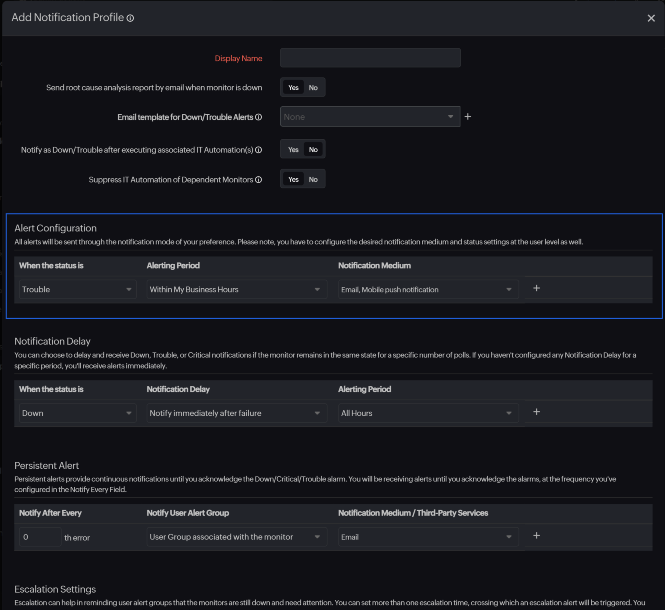- Choose appropriate notification channels: Select targeted channels like Email or Mobile Push instead of SMS under the Notification Medium field for lower-priority alerts to reduce interruption.