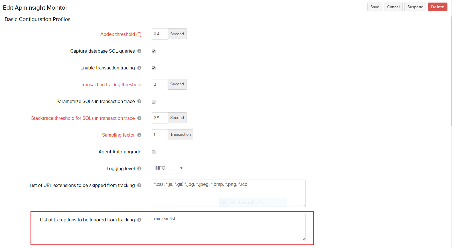 You can exclude specific exceptions from being tracked by Site24x7 APM Insight agent. For instance, exceptions that are thrown as part of the normal application process need not be tracked and can be excluded from being monitored.