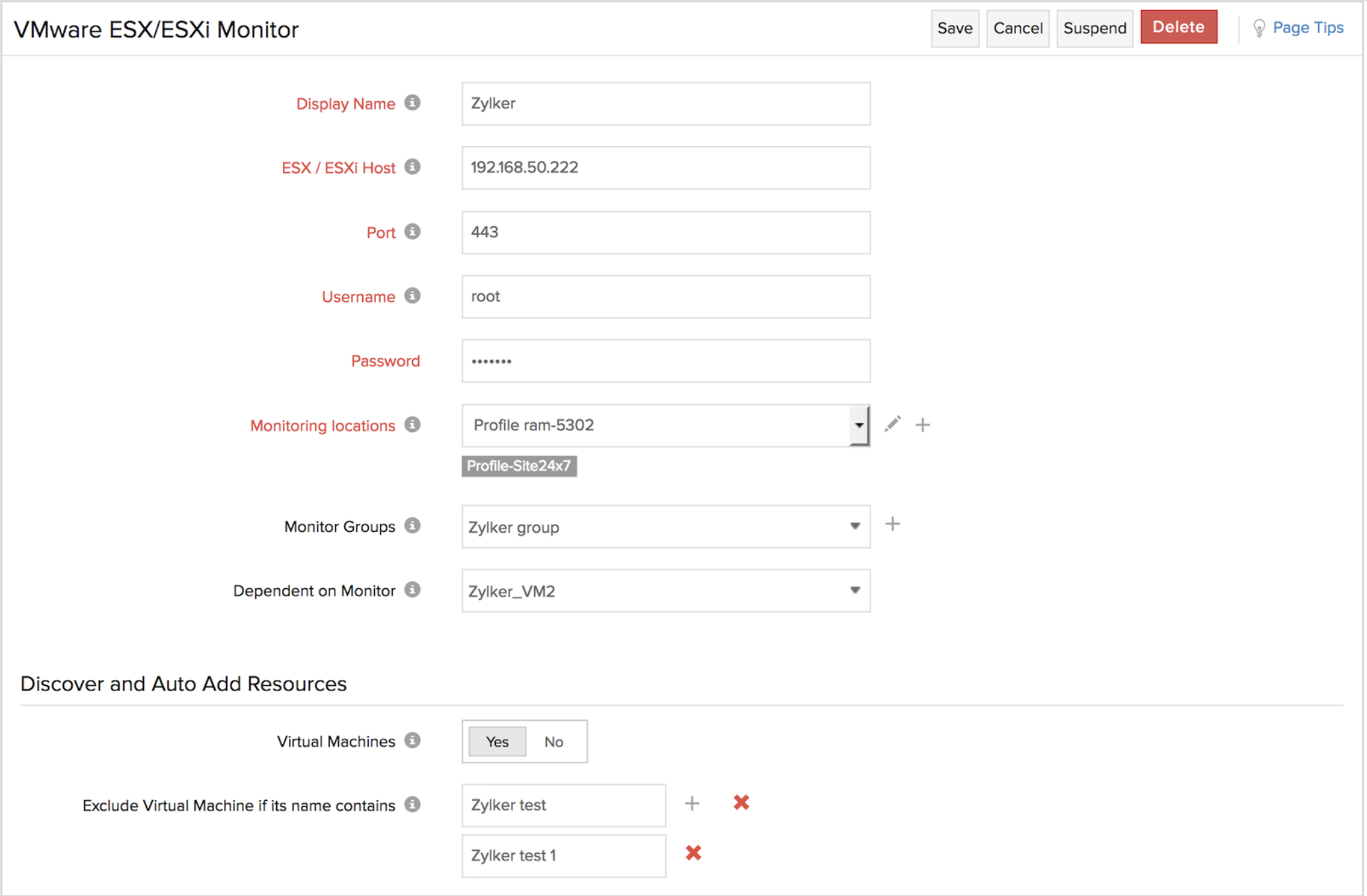 ESX/ESXiの監視を追加すると、ホストで稼働している仮想マシン(VM)を自動でディスカバリーするように選択できます。これらマシンはSite24x7のWebクライアントで、個別の監視として追加され、メトリクスの収集が行われます。