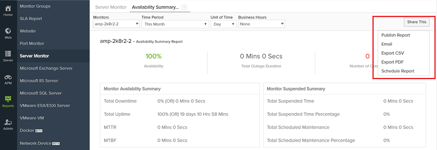 監視レポートをメール通知する以外にも、CVS、PDFのフォーマットでエクスポートすることも可能です。