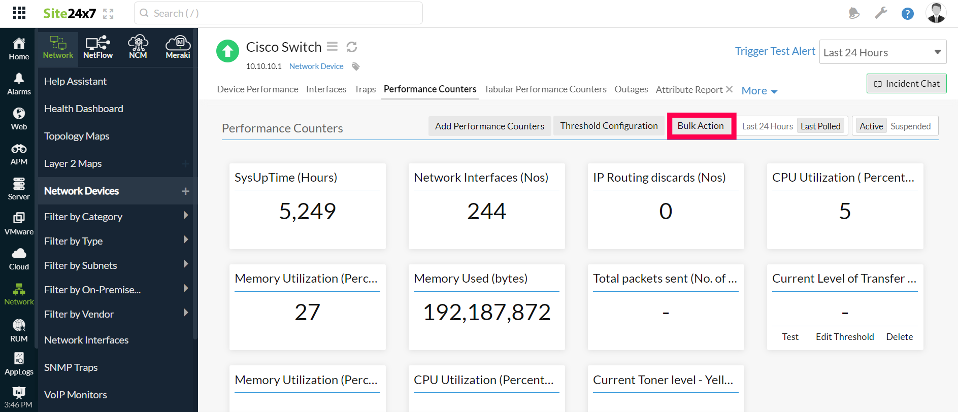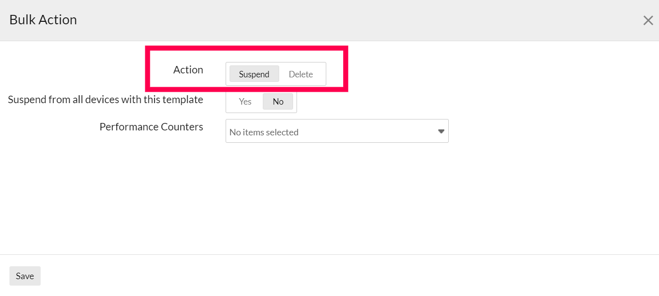You can perform bulk actions on the performance counters only if the device template is the same. Currently, we do not support bulk actions on performance counters with different device templates.