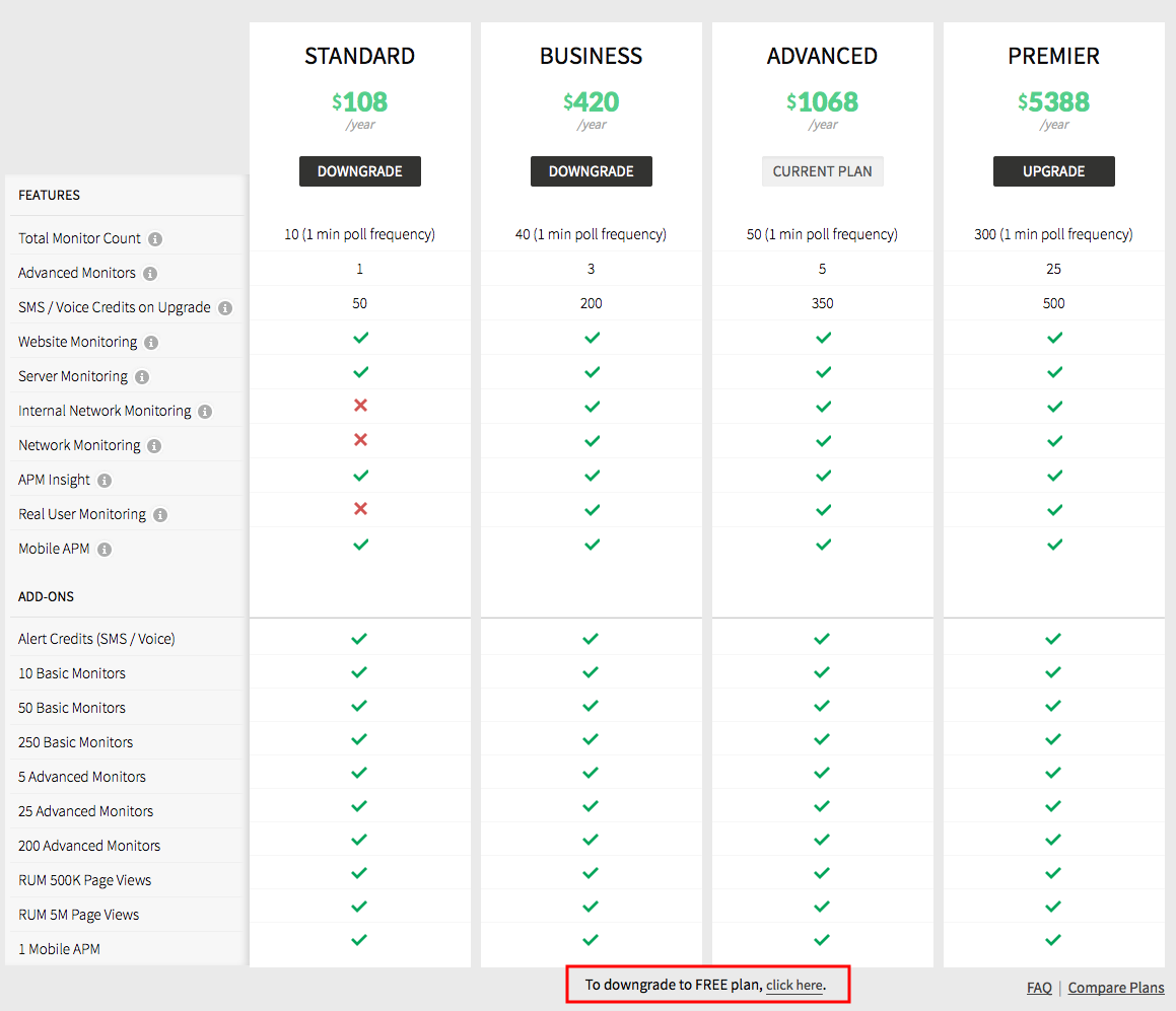 - This will navigate you to the Site24x7 subscription plan page. Click the "downgrade to FREE plan" link given at the bottom of the page