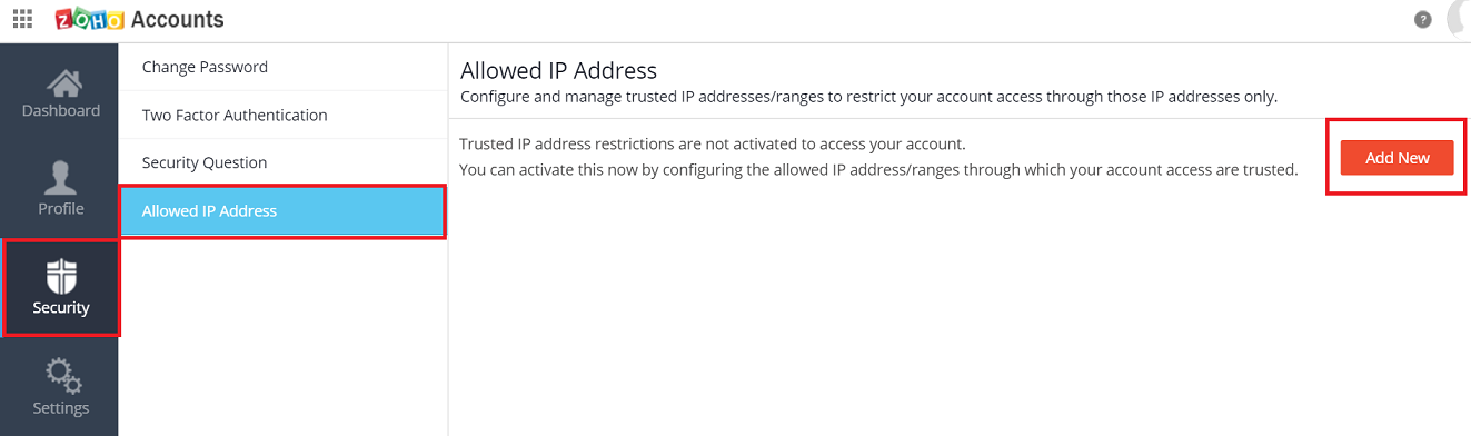 ・directory.zoho.comにアクセスします。その後、[管理画面] → [セキュリティ]の順にアクセスします。セキュリティタブでポリシーを指定し、許可IPを選択します。