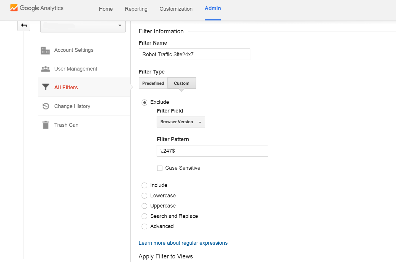 Googleアナリティクスコンソールでフィルターを設定し、そのコンソール上の表示からSite24x7からのアクセスを除外します。この方法がWebページ追跡サービスからトラフィックを除外するのに最も適した方法の1つです。Webトランザクション(リアルブラウザー)監視では、記録したトランザクションをFirefoxブラウザーのバージョンで再生しており、それには一意なバージョンの[dot]247が用いられています。そのため、Googleアナリティクスコンソールで、正確なWebサイト訪問者の追跡のために、このバージョン.247を除外します。