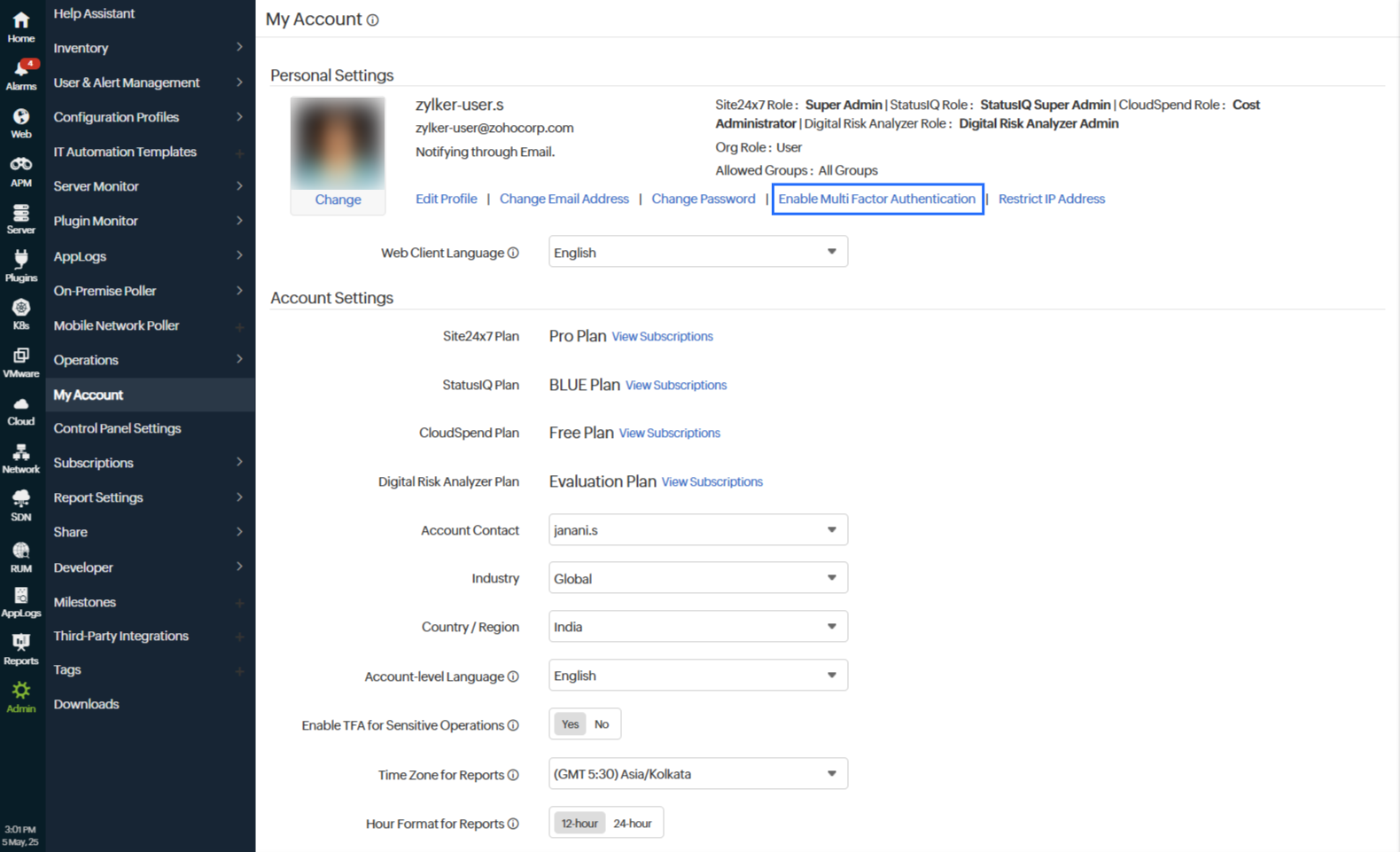 Log in to your Site24x7 account and then navigate to Admin > My Account.