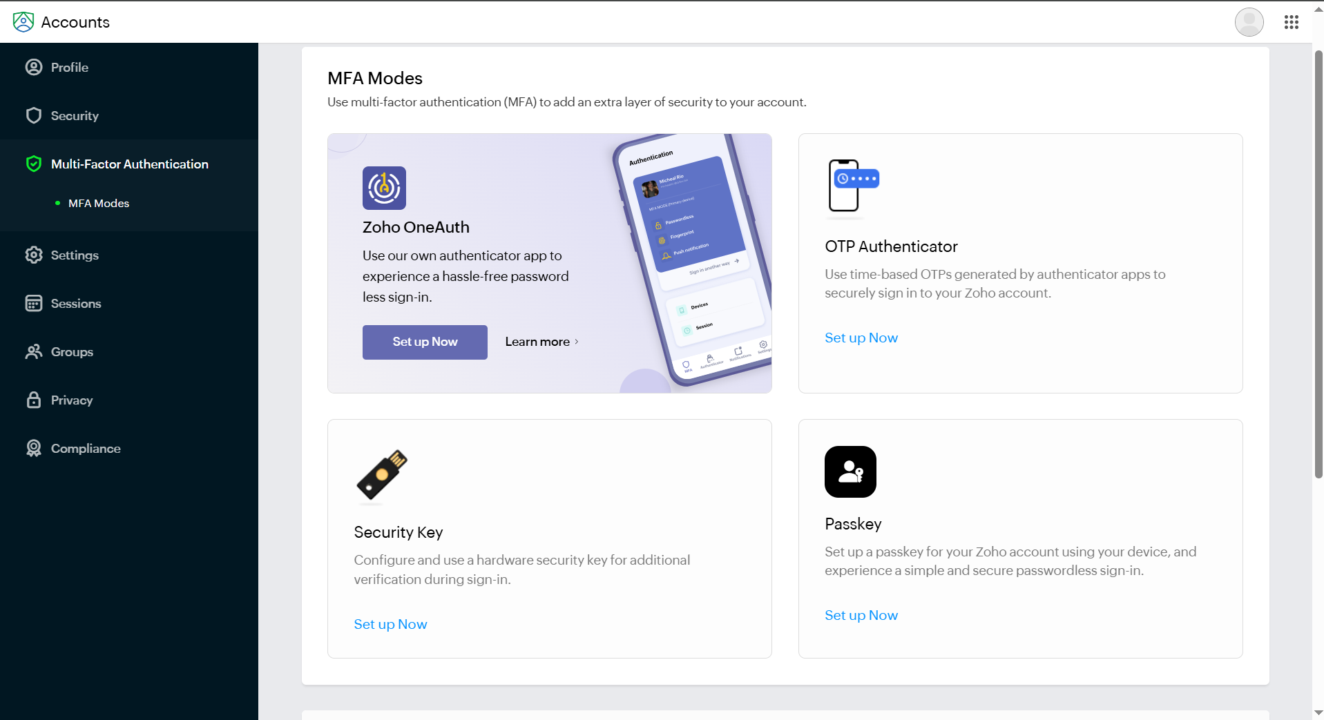 - This will direct you to directory.zoho.com. In the left navigation menu, click Multi-Factor Authentication.