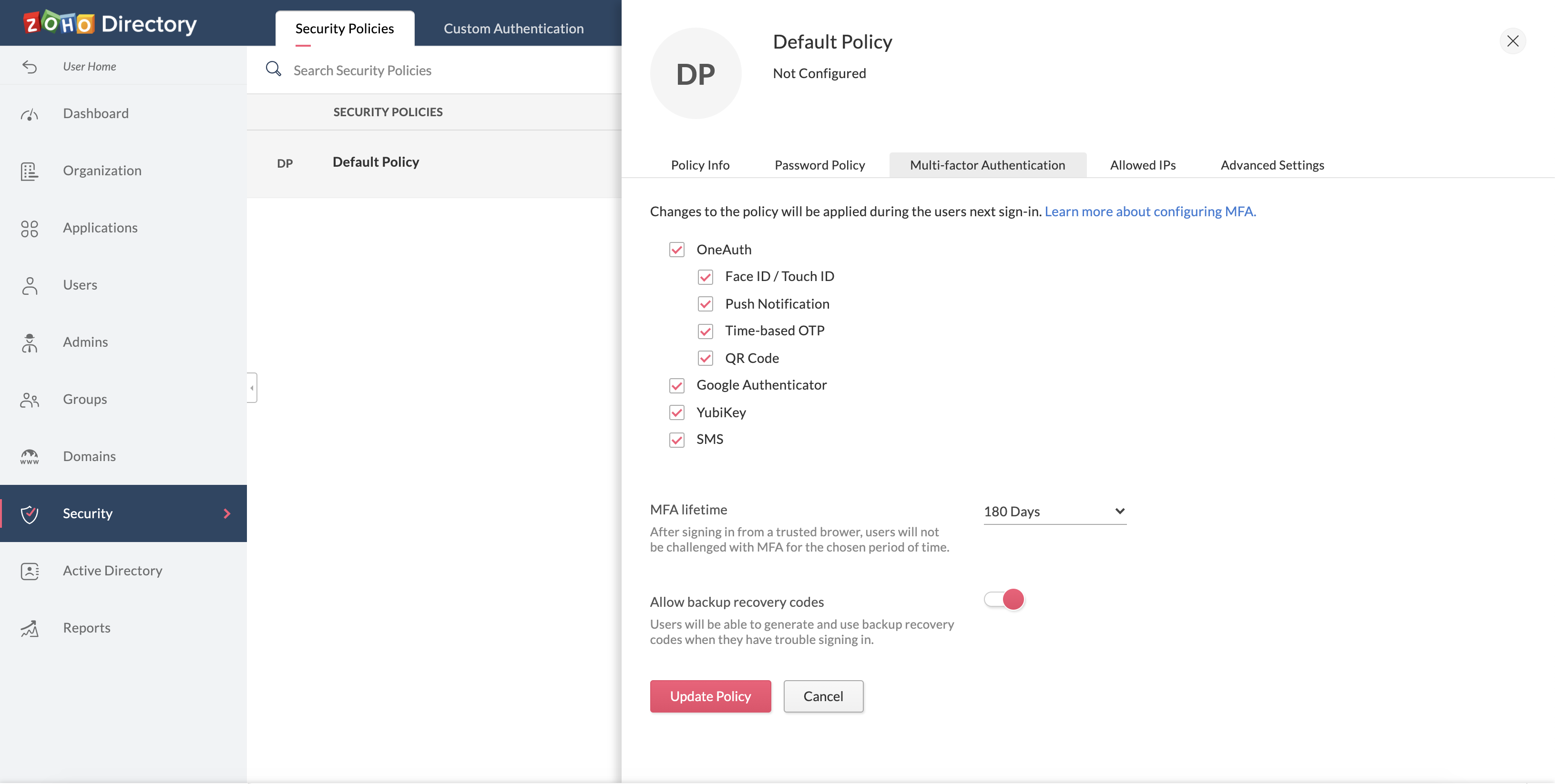- "directory.zoho.com"にリダイレクトされます。管理画面 → セキュリティの順に移動します。セキュリティタブでセキュリティポリシーを選択し、多要素認証を選択します。