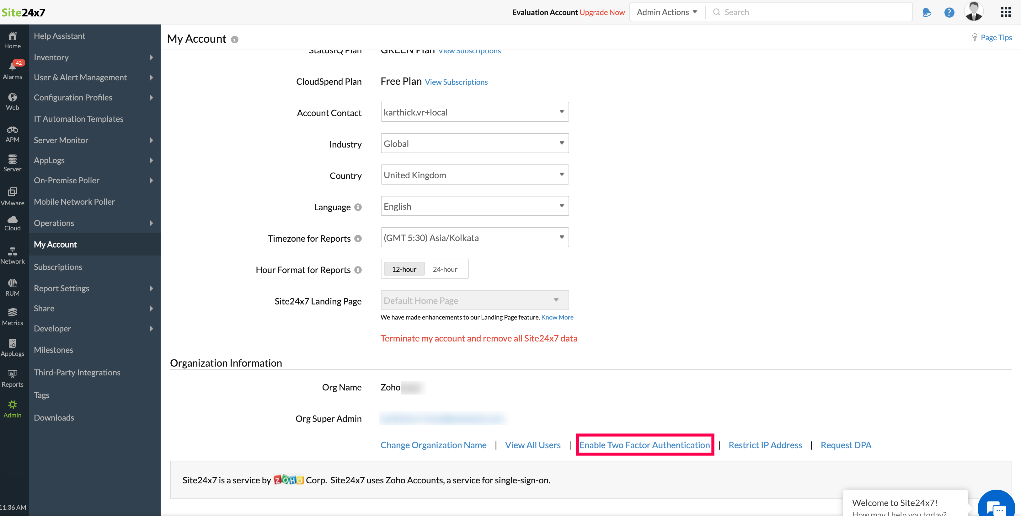 - Site24x7にログインし、マイアカウントに移動します。
