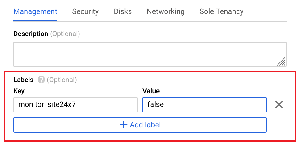 - Log in to your GCP console and add a label for the resources that needs to be excluded for monitoring. For example, provide the Key as monitor_site24x7 and Value as false. During discovery, Site24x7 will auto-associate the tags and show them in the Site24x7 web client.