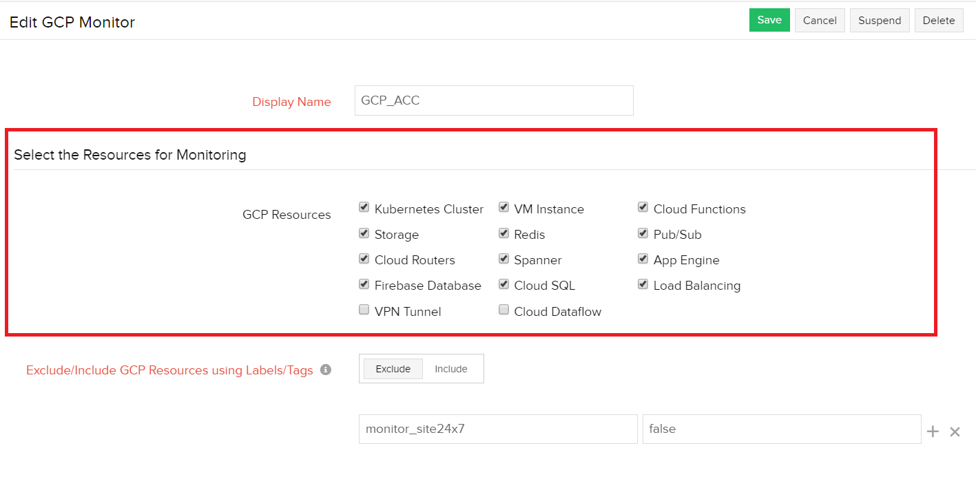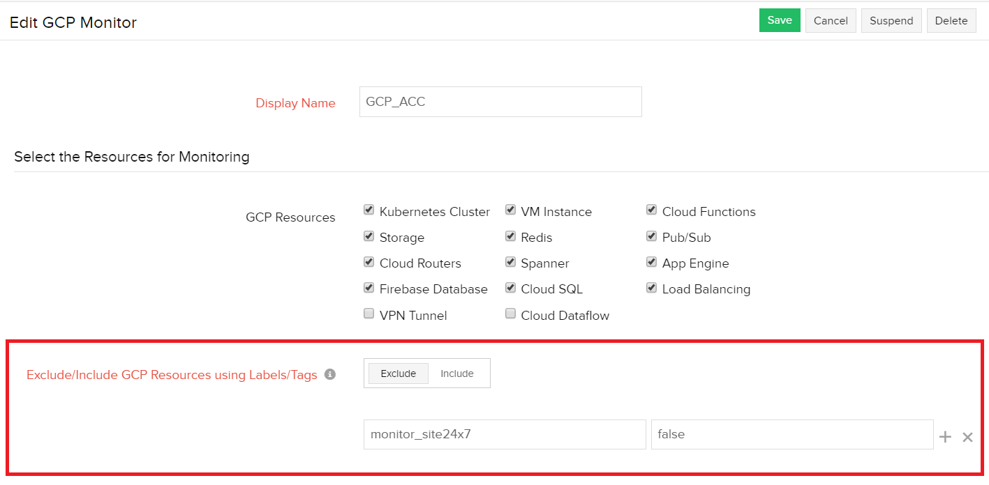 - Exclude/Include GCP Resources using Labels/Tags in the Add/Edit GCP Monitor page.