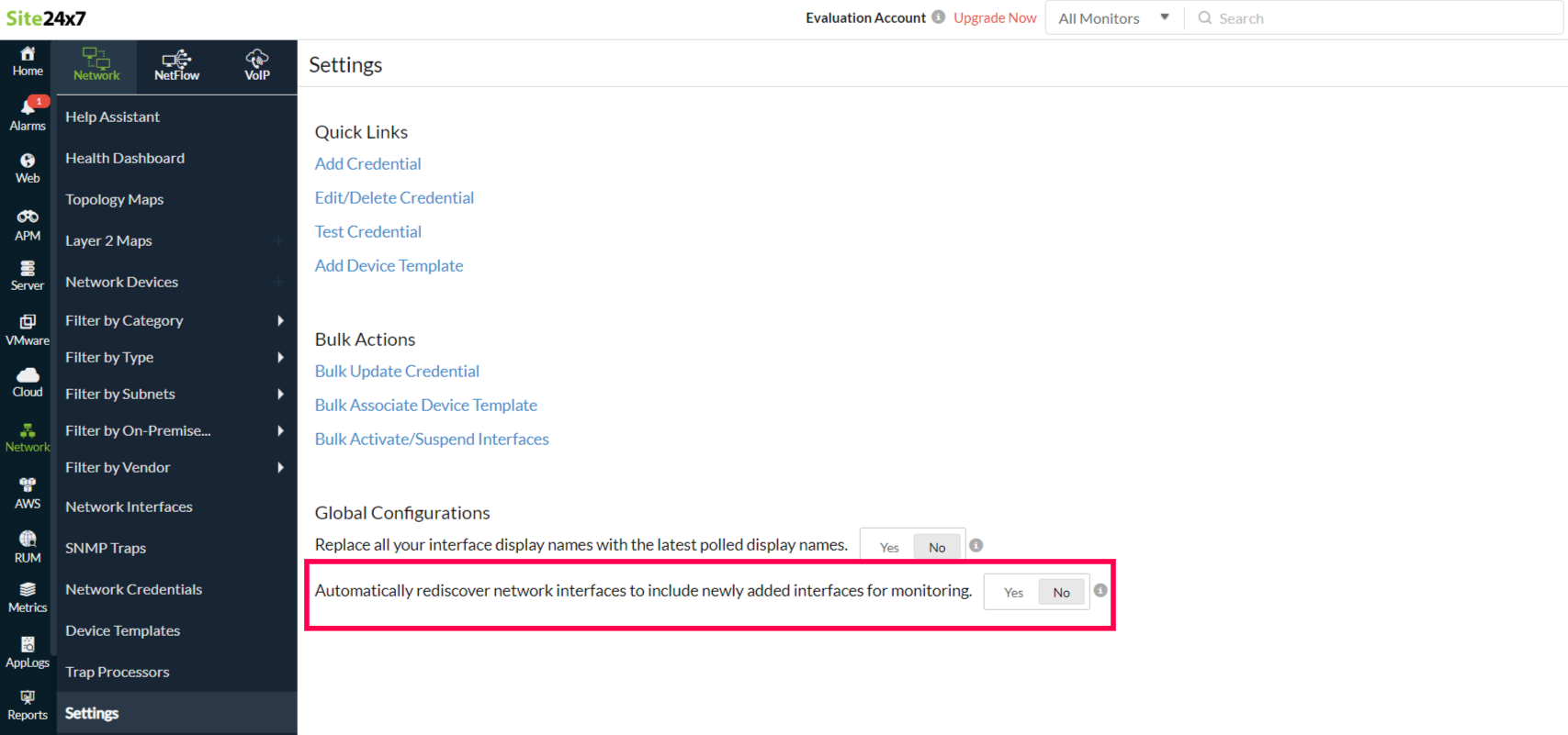 When new interfaces are added to a monitored network device, by default, the Network Module will auto-discover and add them to their corresponding network device, thus consuming your license. This auto-discovery occurs at predefined intervals and will be added based on the latest discoveries. These newly discovered interfaces will be added based on your interface filters but will remain in the active state.