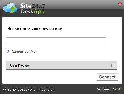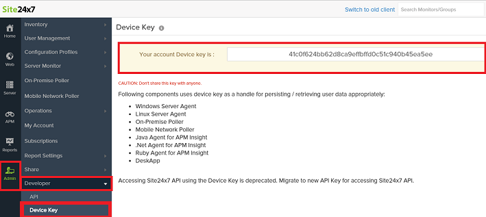 - Get your Device Key from your Site24x7 account by navigating to Admin > Developer > Device Key