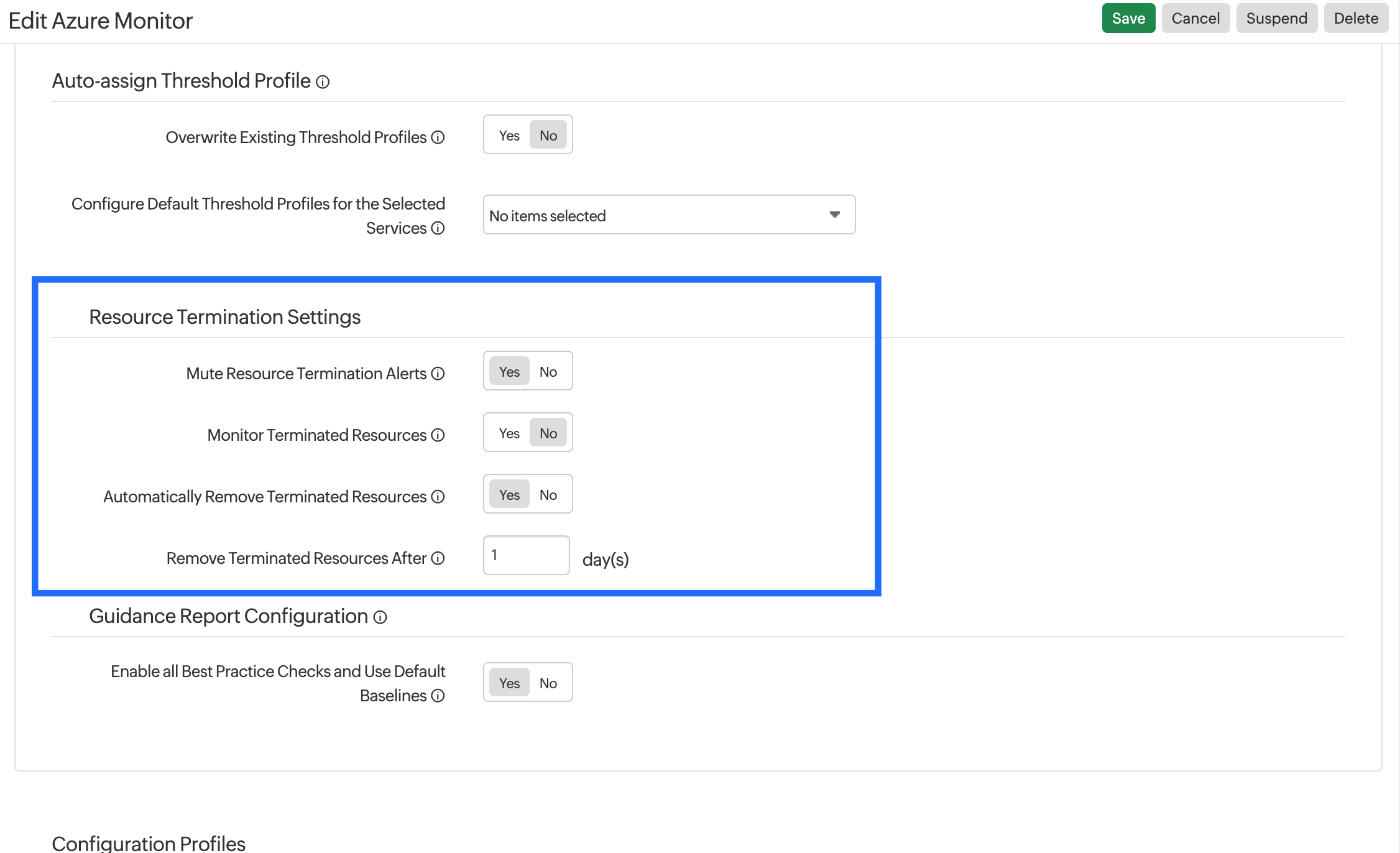 - Resource Termination Settings enabled with >0 days: The resource that gets deleted/removed in the Azure Portal will be suspended immediately and will remain in suspended state for the configured number of days. After the configured time period, the resources will be deleted from Site24x7.