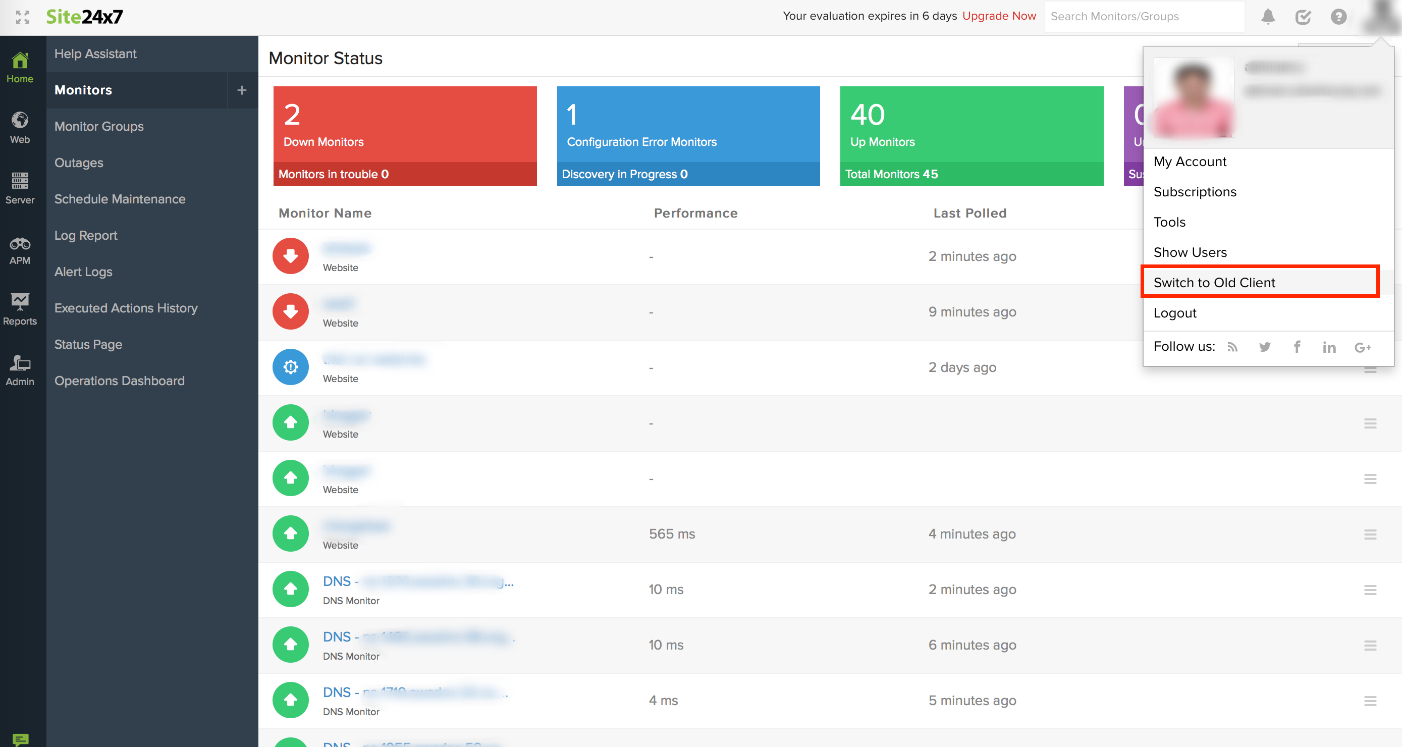 - Select Switch to Old Client. You'll be redirected to Site24x7 old client.