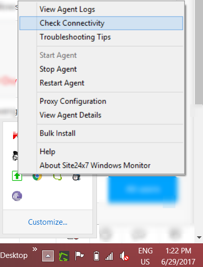 Once the Windows monitoring agent is installed, a tray icon appears in the quick launch bar. The tray icon is also listed in Start > All Programs > Site24x7 Windows Monitor > Tray Icon.