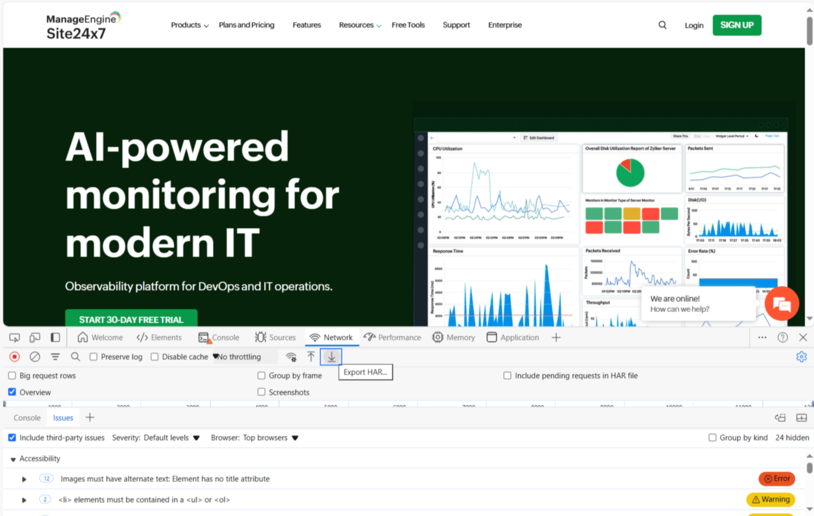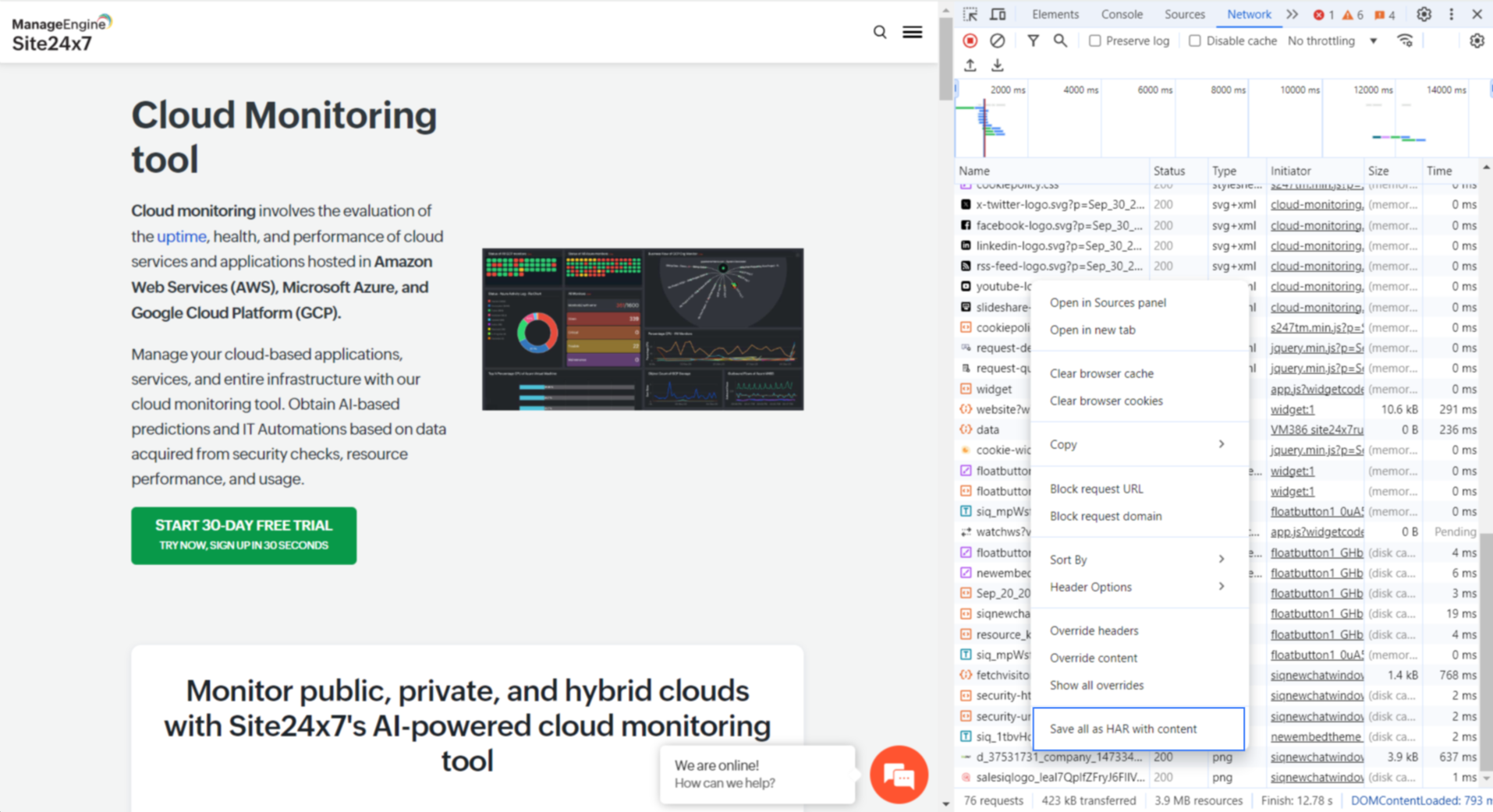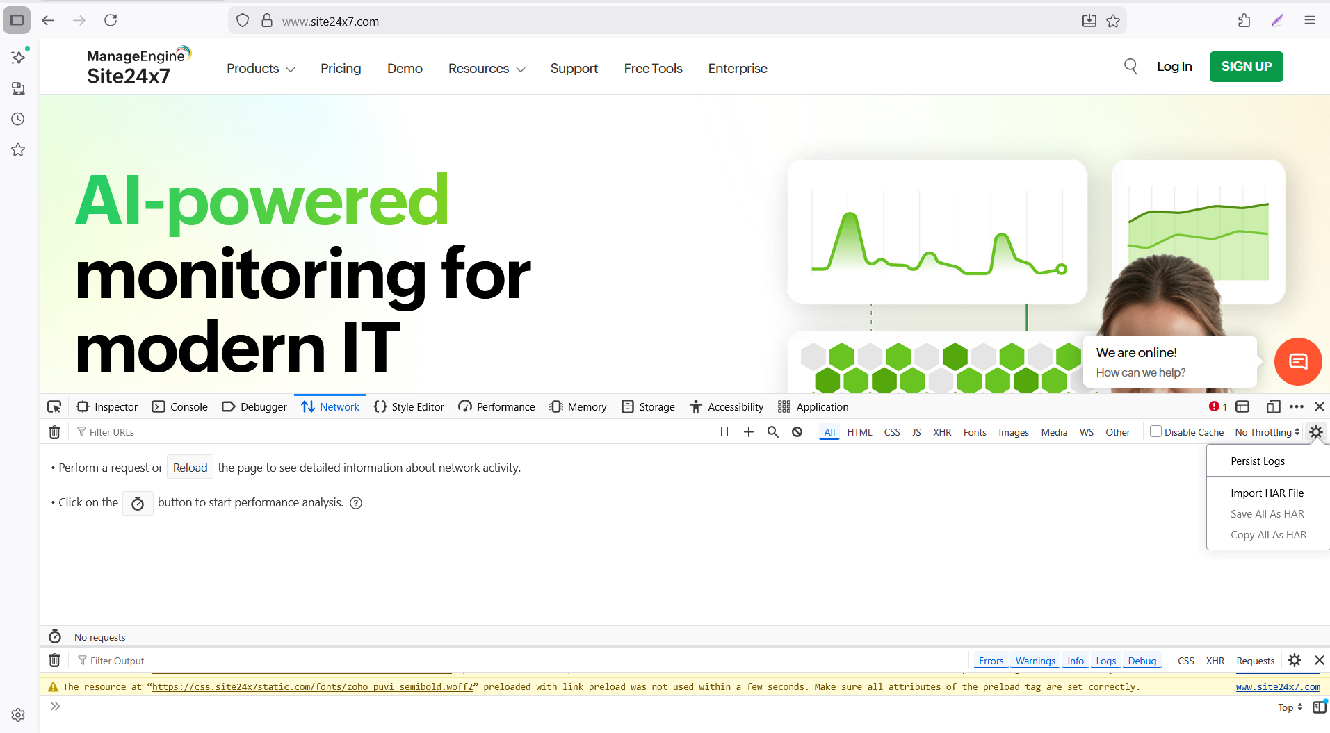 HAR files help troubleshoot issues related to speed, caching, performance analysis, and security assessments. Please follow the steps below to generate a HAR file based on your browser.