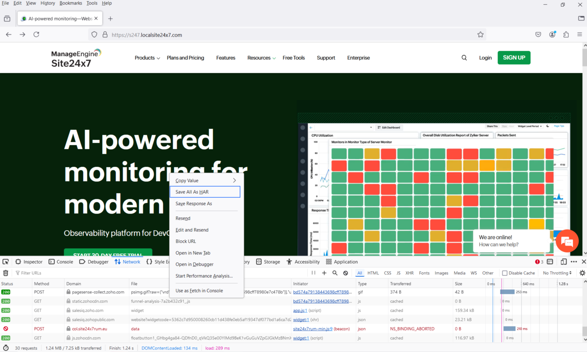 Reload the page and redo the action that initially caused trouble. Right-click any of the files listed and click Save All As HAR.