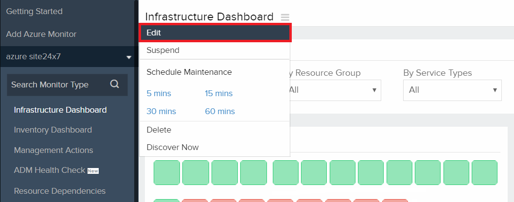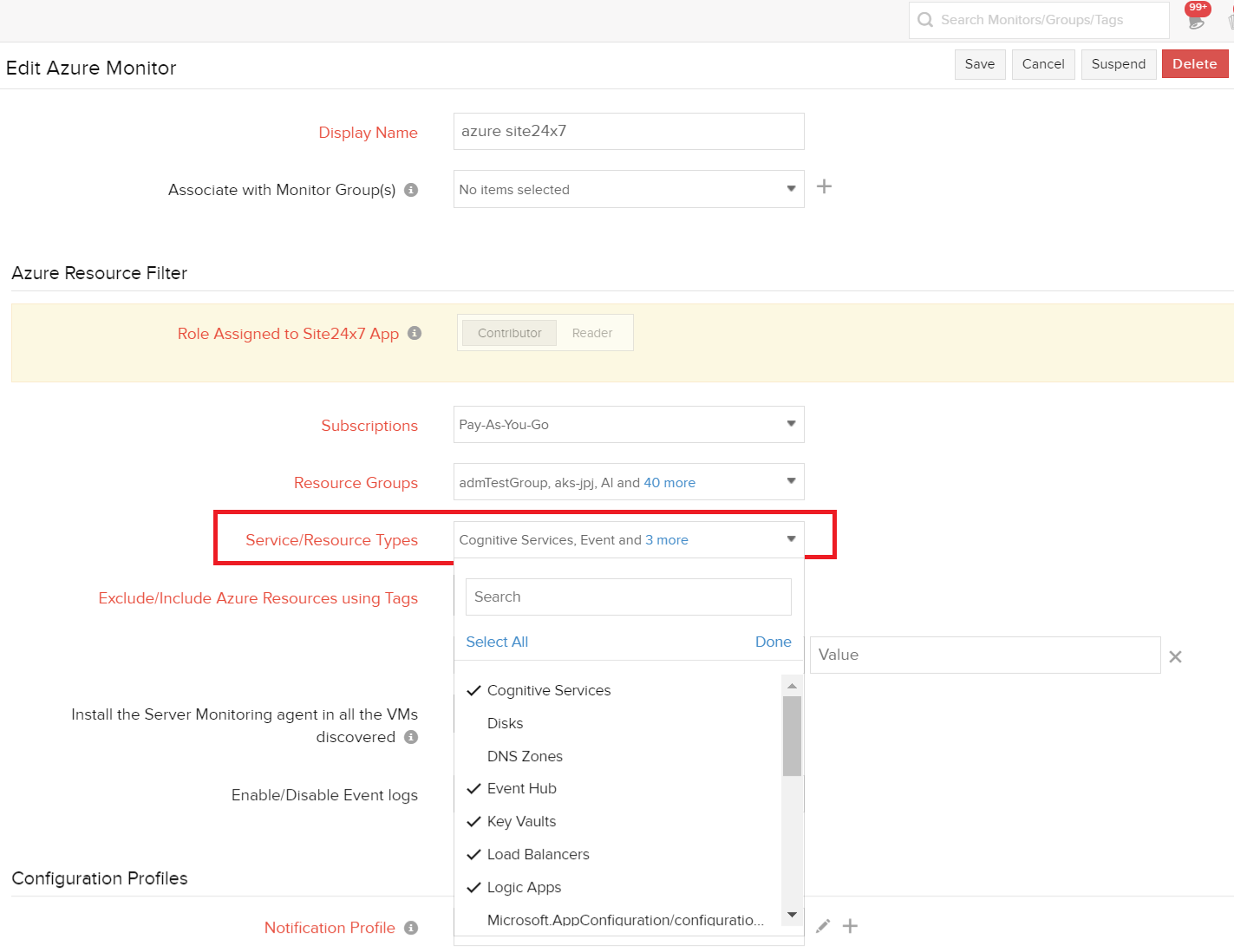 - In the Edit Azure Monitor page, under Azure Resource Filter > Service/Resource Types, deselect the resource types that you do not want to be rediscovered.